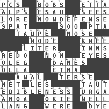 ACROSS 1. Personal Computers (abbr.) 4. Moves up and down 8. Singer James 12. High mountains 14. Son of Isaac 15. Observes 16. Old wives' tales, e.g. 17. Unrelated to defense, as in spending 20. Petty quarrel 21. "Barney Miller" actor Jack 22. Parent Teacher Association (abbr.) 23. Grayish beige 27. Characteristic smell of wine 29. Thickened enlargement 31. Leg joint 34. 61 cubic inches 35. Lodging establishments 36. Make new 39. Immediately 41. Snake ____ (dice throw) 42. Cassini of fashion 43. Natives or inhabitants of Denmark 46. Rounded earthenware pot or jar 47. Inactive volcano in Sicily 48. Of or related to the anus 51. Laconic 54. Soggy 56. French article 58. Strained 61. The property of being fit to eat 66. Capital and largest city of Mongolia 67. Small Philippine buffalo 68. Migrant worker of the '30s 69. 1994 drama film starring Jodie Foster 70. Long (Scottish) 71. We are 72. Color DOWN 1. Friends 2. Hoof sound 3. Small fatty European fish 4. Benjamin's nick name 5. Bear (Spanish) 6. Bar 7. Beer foam 8. Compass dir. 9. 3-inch nail 10. Trial 11. At sea 13. Bristle 18. Age 19. Egg _ yung 24. Single; one (prefix) 25. Plant holder 26. Paradise 28. Atmospheres 30. Eat (away) 32. Compass dir. 33. Double-curved letter 34. Utah city north of Ogden 36. Friend of Pooh 37. Pipe bend 38. Conveyance 40. Electrical Unit 44. Compass dir. 45. Hearing organ 49. Everything 50. Area sheltered from the wind 52. Make senseless or dizzy 53. Having ears or earlike features 54. Welt 55. Pulitzer Prize-winning author Ferber 57. Overwhelm 59. Unsightly 60. Lie 62. Paper or plastic container 63. Make supply last 64. Title for a knight 65. Observe