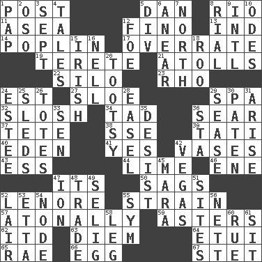 ACROSS 1. Mail 5. Daniel's nick name 8. _ de Janeiro 11. At sea 12. Fine (Spanish) 13. Indiana (abbr.) 14. Cotton for raincoats, e.g. 17. Make much ado about nothing 19. Cylindrical with tapered ends 21. Ringlike coral islands and reefs 22. Grain storage tower 23. 17th letter of the Greek alphabet 24. Eastern Standard Time (abbr.) 27. _ gin 29. Health resort 32. Splash clumsily 34. Bit 36. Singe 37. Wig 38. Compass dir. 39. Jacques of French films 40. Paradise 41. Consenting reply 42. Flower holders 43. Curvy letter 44. Welles in "The Third Man" 46. Compass dir. 47. ___ a Wonderful Life 50. Droops 52. Poe poem 55. Put through a sieve 57. Without tonality 59. Michaelmas daisies 62. It would 63. South Vietnam president (1954) 64. Needle case 65. Actress Charlotte 66. Oval reproductive body of a fowl 67. Proofreading order DOWN 1. Infant food 2. Bear (Spanish) 3. Back-to-school mo. 4. Stories 5. HTML Container Element 6. Approach 7. _ pole 8. Monetary unit of Yemen 9. International (abbr.) 10. Lyric poems 12. Enemy 15. From or relating to Ireland 16. 1994 drama film starring Jodie Foster 18. Friend of Pooh 20. A girl or young woman (variant) 24. First name in cosmetics 25. Bobsleighs 26. Hauls 28. Artist's stand 29. Gospel singer Marvin 30. Eucharist need 31. Originate 33. Elected rep. 35. Cease 36. R.R. building 42. Viva Las _ 45. Hindu Mythology: god of death 47. Electrically charged atom 48. Buy and sell 49. Former Milwaukee Brewers owner Bud 51. Locates 52. Den 53. Singer James 54. Thickened enlargement 55. Symbol (abbr.) 56. Remaining after all deductions 58. Part of a journey 60. Sorrow 61. Be seated