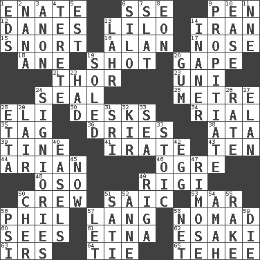 ACROSS 1. Related on the mother's side 6. Compass dir. 9. Animal enclosure 12. Natives or inhabitants of Denmark 13. _ and Stitch 14. SW Asia republic 15. Derisive sound 16. ____ Jay Lerner 17. Sense of smell 18. One (Scot) 19. Opportunity 20. Open wide 21. Son of Odin 23. Single; one (prefix) 24. Lick closed 25. Distance measurement (Brit.) 28. Connecticut Ivy Leaguer 30. Writing tables 34. Monetary unit of Yemen 35. Label 36. Frees from moisture 38. "One Day ___ Time" 39. Prong on a fork 41. Feeling or showing extreme anger 43. Nine, plus one 44. Believer in; advocate of (suffix) 46. Legendary monster 48. Bear (Spanish) 49. Swiss mountan, "Queen of the Mountains" 50. Group working together 51. Ketch in the Levant 53. Spoil 56. Silvers or Donahue 57. Austrian-born American filmmaker Fritz 58. Wanderer 60. Observes 61. Inactive volcano in Sicily 62. 1973 Nobel Price Winner (Physics) Leo 63. Big collection agency 64. Make a knot 65. Giggle DOWN 1. Begley and Asner 2. Grandmother 3. At once, immediately (arch.) 4. Cylindrical with tapered ends 5. Eastern Standard Time (abbr.) 6. Grain storage tower 7. Narrow board 8. Period of immesurable duration 9. Conciliate 10. Relaxation 11. Compass dir. 13. Cowardly lion portrayer 14. Sillier 19. Having a sole or soles 20. Chewing product 22. Possessed 24. Seigniories (variant) 26. Pace 27. Style 28. Singer James 29. Den 31. _ Lanka 32. Apertif with cassis 33. Ocean 37. Unemotional 40. Artist's stands 42. Oval reproductive body of a fowl 45. Immediately 47. Full of chinks, cracks, or crevices 49. Port city in Latvia 50. "Mermaids" star 51. Suttee (variant) 52. Queen of England 1702-14 54. Housemaid 55. Immoral or dissolute person 56. 23rd letter of the Greek alphabet 57. Allow 58. Fish or hair follower 59. Expire