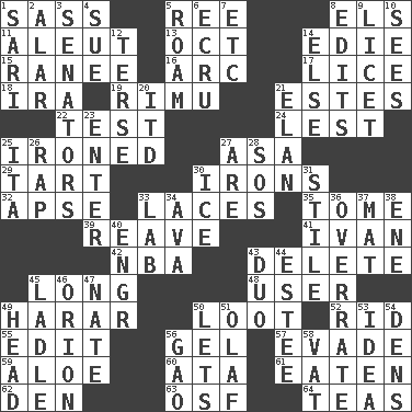 ACROSS 1. Backtalk 5. Portuguese money of account (variant) 8. Raised railways 11. Native American of Southwest Alaska 13. Sep. follower 14. Singer Brickell 15. The wife of a rajah (variant) 16. Curve 17. Louse (plural) 18. Lyricist Gershwin 19. Tall New Zealand timber tree 21. _____ Park, CO 22. Trial 24. For fear that 25. Pressed 27. White ___ sheet 29. Small pie 30. Removes the wrinkles 32. Domed church section 33. Shoestrings 35. Heavy book 39. Rob, plunder, or pillage 41. _ the terrible 42. Basketball assoc. 43. Keyboard key 45. Protracted 48. One who makes use of a thing 49. Ethiopian city, capital of Harari 50. Plunder 52. To free from 55. Prepare for publication 56. Set 57. Dodge 59. _ vera 60. _ moment's notice (2 wds.) 61. Ingested 62. Lair 63. Order of Saint Francis (abbr.) 64. Afternoon social gatherings DOWN 1. Indian skirt 2. Having or resembling wings 3. Elected representatives 4. Institute legal proceedings 5. Wander aimlessly 6. Shade of tan 7. And so on (abbr.) 8. Prepares for publication 9. It is permitted: Lat. 10. Observes 12. Laconic 14. Otherwise 20. It would 21. Liveliness 23. Keyboard key 25. Call ___ day 26. Reproach for some lapse or misdeed 27. "We ___ not amused" (Victoria) 28. Distress signal 30. Frozen water 31. Vertical member of a panel or frame 33. Experiment locale 34. Actress Gardner 36. Make much ado about nothing 37. Floor covering 38. Compass dir. 40. Engineer (abbr.) 43. Superhero pair 44. First name in cosmetics 45. Dipping utensil 46. Greek mythologigal hunter 47. Nathan's nickname 49. Froth on beer 50. Allows 51. Norwegian king 53. The main thing one is thinking about 54. Hiding places for outlaws 56. E Mali city 58. Large container