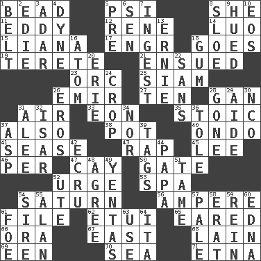 ACROSS 1. Necklace unit 5. 23rd letter of the Greek alphabet 8. A female animal or person 11. Whirlpool 12. French philosopher Descartes 14. Nilotic language 15. Climbing, woody, usually tropical vines 17. Engineer (abbr.) 18. Leaves 19. Cylindrical with tapered ends 21. Followed as a consequence or result 23. The grampus (Milton) 25. Thailand, formerly 26. Arab leader 27. "___ Little Indians" 28. Separate the seeds from cotton 31. Wind 33. Period of immesurable duration 35. Unemotional 37. In addition 38. Plant holder 40. Southwest Nigerian state 41. Gospel singer Marvin 43. Reproach for some lapse or misdeed 45. Area sheltered from the wind 46. For each 47. Island 50. Yard entry 52. Goad 53. Health resort 54. Titan orbits this 56. Electrical Unit 61. Do some clerical work 62. Needle holder 65. Having ears or earlike features 66. Mouth or opening 67. 90 degrees 68. (Had) reclined 69. Car or cant ending 70. Ocean 71. Inactive volcano in Sicily DOWN 1. Waist strap 2. Singer Brickell 3. The sixth month of the Jewish calendar 4. Unit of force 5. Before (prefix) 6. Elected rep. 7. Eat 8. A type of plum 9. Took on color 10. Greek goddess of the dawn 13. Bert's buddy 16. Smallest unit of an element 18. Chewing product 20. 4th largest of the Great Lakes 22. Without 24. Riding implement 26. Greek god of love 28. Went 29. Assistant 30. Non-commissioned officer (abbr.) 31. Toward shelter 32. Austrian river, tributary to the Danube 34. And not 36. Lacquered or enameled metalware 37. Viper 39. Labels 42. Shade of tan 44. Dad 48. Match 49. Gossips 51. Docile 52. Shoshoni 54. Title for a man of rank and authority 55. ____ Jay Lerner 57. Diluted with white 58. Part of Q.E.F. 59. It's straight from the horse's mouth 60. Pulitzer Prize-winning author Ferber 61. Enemy 63. Purpose 64. Call ___ day
