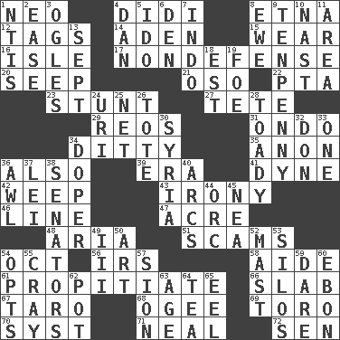 ACROSS 1. Modern: prefix 4. "You Light Up My Life" star Conn 8. Inactive volcano in Sicily 12. Labels 14. Arabian gulf 15. Erode 16. Small island 17. Unrelated to defense, as in spending 20. Ooze 21. Bear (Spanish) 22. Parent Teacher Assoc. 23. Check the growth or development of 27. False hair 29. Vintage cars 31. Southwest Nigerian state 34. Short, simple song 35. Soon (poet.) 36. In addition 39. Period 41. Centimeter-gram-second unit of force 42. Shed a tear 43. Literary sarcasm 46. Actor's bit 47. Measure of real estate 48. Operatic vocal solo 51. Fraudulent business schemes 54. Sep. follower 56. Big collection agency 58. Helper 61. Conciliate 66. Thick slice 67. Edible starchy tuberous root 68. Double curve, resembling the letter S 69. "Corrida" creature 70. System (abbr.) 71. Anneal 72. Elected rep. DOWN 1. Nuclear Threat Initiatives 2. Relaxation 3. Stares 4. One of the 12 tribes of Israel 5. Wedding promise 6. Lair 7. Southeast Asian peninsula 8. She-sheep 9. 3-inch nail 10. Political cartoonist Thomas 11. Type of rug 13. Back-to-school mo. 18. Eastern Standard Time (abbr.) 19. Enemy 24. RI univ. 25. Fish or hair follower 26. Carry 28. Sycophant 30. Damascus' land 32. Spanish title 33. Single 34. Drug addict 36. Leather borer 37. Flowery wreath 38. Legislators 40. Curves 44. The grampus (Milton) 45. Teachers' org. 49. One more than two 50. Nonscientific branch of learning 52. Vertical spar for supporting sails 53. Grain storage towers 54. Elects 55. Supercomputer manufacturer 57. The Jewish people; Israel 59. Have the gumption 60. Inky black, to poets 62. Cooking vessel 63. Personal question 64. Beverage made from leaves 65. Snakelike fish