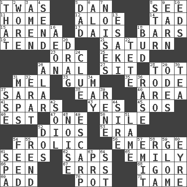 ACROSS 1. It was, poetically 5. Daniel's nick name 8. Perceive with the eye 11. Residence 12. Medicinal plant 14. Bit 15. Sports stadium 17. Raised platform 18. Oblong pieces of solid material 19. Looked after 21. Titan orbits this 23. The grampus (Milton) 25. Made supply last 26. Of or related to the anus 27. Be seated 28. Small child 31. Cartoonist voice _ Blanc 33. Chewing product 35. Eat (away) 37. "Two Mules for Sister ____" 38. Hearing organ 40. Length times width 41. Practice fights 43. It is so 45. Mayday 46. Eastern Standard Time (abbr.) 47. Single 50. "Death on the ____" 52. "Vaya con ____" 53. Epoch 54. Play 56. Develop 61. Perceives with the eye 62. Plant excrements 65. Poet Dickinson 66. Writing instrument 67. Blunders 68. Composer Stravinsky 69. Say or write further 70. Cooking vessel 71. Docile DOWN 1. Not this but _ 2. Had on 3. So be it 4. Transmit 5. June honoree 6. According to 7. Annoying sounds 8. Play the lead 9. Merit 10. Begley and Asner 13. 1973 Nobel Price Winner (Physics) Leo 16. Period of immesurable duration 18. Partially opened flower 20. To be drawn or hauled along 22. False hair 24. A slight indication 26. Having or resembling wings 28. "Corrida" creature 29. Lyric poems 30. Afternoon social gathering 31. Atlas contents 32. Part of Q.E.F. 34. Fifth month 36. To erase 37. Compass dir. 39. French philosopher Descartes 42. Earth 44. The founder of a family 48. Annoying sound 49. Fortification 51. Unable to walk 52. Two (Sp.) 54. Nourish 55. Tear apart 57. Send forth 58. Capital of Latvia 59. Take by theft 60. Jane of fiction 61. Health resort 63. Adept person 64. Fast jet (abbr.)