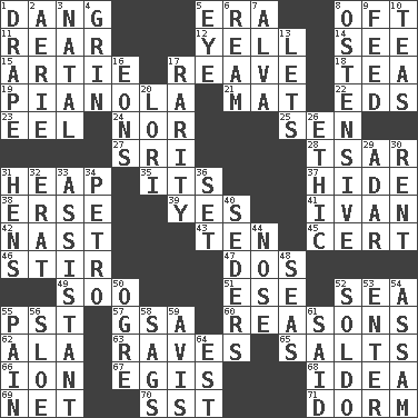 ACROSS 1. Mild oath, euphamism for damn 5. Epoch 8. Often (poetically) 11. Rump 12. Shout 14. Perceive with the eye 15. Nick name for Arthur 17. Rob, plunder, or pillage 18. Afternoon social gathering 19. Player piano 21. Floor covering 22. Begley and Asner 23. Snakelike fish 24. Or not 25. Elected rep. 27. _ Lanka 28. Russian ruler of old 31. Pile 35. ___ a Wonderful Life 37. Flintstone garb 38. Celtic language 39. Affirmative reply 41. _ the terrible 42. Political cartoonist Thomas 43. Nine, plus one 45. Sure thing 46. Commotion 47. Two (Sp.) 49. "Barney Miller" actor Jack 51. Compass dir. 52. Ocean 55. Pacific Standard Time (abbr.) 57. Girls' org. (abbr.) 60. Thinks logically 62. Chicken ___ king 63. All-night dance parties 65. Table seasonings 66. Electrically charged atom 67. Armor plate that protects the chest 68. The content of cognition 69. Fish or hair follower 70. Fast jet (abbr.) 71. Dormintory (informal) DOWN 1. Window treatment 2. Nest on high 3. Relating to or accompanying birth 4. Smile widely 5. Sight organ 6. 480, 500 or 516 sheets of paper 7. Inventor's middle name 8. Clearly or manifestly demonstrative 9. Nourish 10. Afternoon social gatherings 13. Allows 16. Immeasurably long periods of time 17. Noteworthy scarcity 20. Australian parrot (variant) 26. Principle of right and wrong 29. The sixth month of the Jewish calendar 30. Monthly bill 31. Coop moms 32. Part of Q.E.F. 33. Helper 34. Stone: prefix 36. Arrange properly for use 40. Spring feasts 44. Sense of smell 48. Oceans 50. Legendary monster 52. Twentieth part of a lira 53. Keyboard key 54. Indian state 55. Ache 56. A type of plum 58. Settles 59. Opinion 61. Stated 64. Eastern Standard Time (abbr.)