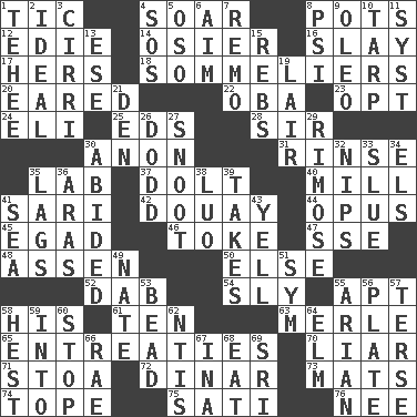 ACROSS 1. Nervous spasm 4. Fly high 8. Plant holders 12. Singer Brickell 14. Flexible twig of a willow tree 16. Kill 17. Possessive pronoun 18. Wine waiters 20. Having ears or earlike features 22. Chief or king in Benin or Nigeria 23. Choose 24. Connecticut Ivy Leaguer 25. Begley and Asner 28. Title for a knight 30. At once, immediately (arch.) 31. Wash lightly 35. Experiment locale 37. Dunce 40. Place where flour is made 41. Indian skirt 42. A city in N France, SE of Calais 44. Musical composition 45. Mild oath 46. Puff or smoke 47. Compass dir. 48. NE Netherlands city 50. Otherwise 52. Apply (a substance) by light strokes 54. Insidious 55. Fitting 58. Part of HMS, perhaps 61. Nine, plus one 63. Haggard of country music 65. Pleas 70. One who doesn't tell the truth 71. Portico 72. Middle Eastern gold or silver currency 73. Floor coverings 74. Drink excessively 75. Suttee (variant) 76. Born DOWN 1. Giggle 2. Standard of perfection 3. High-altitude cloud 4. Distress signal 5. Bear (Spanish) 6. Direct toward a target or goal 7. San ____ (Riviera town) 8. Air pressure measure (abbr.) 9. Butter sub 10. Canvas cover 11. System (abbr.) 13. Compass dir. 15. Confederate soldiers (slang) 19. Den 21. Lair 26. Texas town _ City 27. Snout, nose 29. Full of chinks, cracks, or crevices 30. Tolerated 32. Cuts off 33. Turn sharply 34. Raised railways 35. Straggles 36. Ancient river in northeast Turkey 38. Nilotic language 39. Proceeds 41. Ocean 43. Shout 49. Nathan's nickname 51. Symbol (abbr.) 53. Necklace unit 55. Believer in; advocate of (suffix) 56. Food holder 57. Laconic 58. Behest 59. To the inside or interior of 60. Obstruct or block passage 62. Nuclear Threat Initiatives 64. Shade tree 66. Actress Charlotte 67. _ tizzy (2 wds.) 68. Consume 69. Indian title of respect (Mr.)