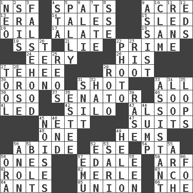 ACROSS 1. Overdraft (abbr.) 4. Arguments over trivial matters 9. 1/640 square mile 13. Epoch 14. Stories 15. Downhill vehicle 16. Lubricate 17. Having winglike extensions 18. Without 19. Fast jet (abbr.) 21. Whopper 22. First class 24. Suggestive of the supernatural 26. Part of HMS, perhaps 27. Giggle 29. Carrot, for example 30. U. of Maine site 31. Guess 33. 100% 36. Bear (Spanish) 37. Legislator 40. "Barney Miller" actor Jack 41. Directed 42. Grain storage tower 43. Columnist Joseph or Stewart 45. Remaining after all deductions 47. Sets or collections 48. Single 49. Equivocates 50. Stay 52. Compass dir. 54. Parent Teacher Assoc. 56. Singles 57. Peak District village in England 59. Sandy's bark 61. Hero or heavy, e.g. 62. Haggard of country music 63. Non-commissioned officer (abbr.) 64. Pismires 65. The state of being joined or united 66. Definite Article DOWN 1. Modern: prefix 2. Indian titles of respect 3. It jiggles the polygraph 4. R.R. building 5. Chummy 6. Mountain range southwest of Kyrgyzstan 7. Wig 8. Compass dir. 9. Aid 10. Burrowing marine mollusk 11. French philosopher Descartes 12. Begley and Asner 20. Adolescent 22. Picture 23. River (Sp.) 25. Vintage cars 27. Implement 28. Celtic language 29. Printing process, for short 31. In a ____ (agitated or irritated) 32. Actor Linden 33. Aide 34. Spoils 35. Chops off 38. First name in cosmetics 39. Raze (variant) 44. Mass 45. Annoying sounds 46. Conclusion 49. Phone greeting 50. Soon (poet.) 51. Waist strap 52. Locale of original sin 53. Indian skirt 55. Bowlike part 56. Mouth or opening 57. Australian flightless bird 58. Car or cant ending 60. Enemy