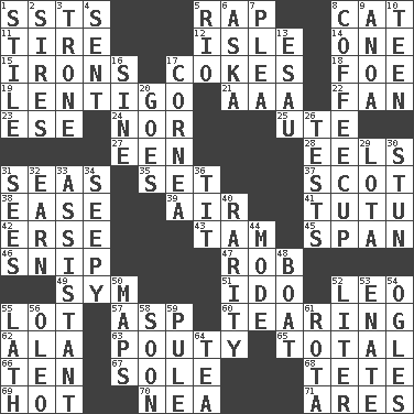 ACROSS 1. Fast planes 5. Hit sharply and swiftly 8. Feline 11. Become fatigued 12. Capri or Wight 14. Single 15. Metal shackles 17. Popular sodas 18. Enemy 19. Small, flat, pigmented spot on the skin 21. Auto club (abbr.) 22. Air blower 23. Compass dir. 24. Not either 25. Shoshoni 27. Car or cant ending 28. Snakelike fish 31. Oceans 35. Arrange properly for use 37. Highlander 38. Relaxation 39. Wind 41. Ballerina skirt 42. Celtic language 43. Scottish cap 45. Connect, as a bridge 46. Sever or remove by pinching or nipping 47. Director Reiner 49. Symbol (abbr.) 51. Wedding promise 52. Lion 55. Car dealer's back yard 57. Viper 60. Separating forcefully 62. In the manner of 63. Inclined to pout 65. "_____ Recall" 66. Nine, plus one 67. Flatfish 68. Wig 69. Being at a high temperature 70. Teachers' org. 71. Ancient Greek god of war DOWN 1. Vertical member of a panel or frame 2. Titles for men of rank and authority 3. Heavy duty weighing machine 4. Emitted 5. _ de Janeiro 6. "____ silly question..." 7. Entreaty 8. Java holder (2 wds.) 9. Small Philippine buffalo 10. Adolescent 13. He sold his birthright 16. Trig term 17. Pupil covering 20. Leaves 26. Trials 29. Globular water bottle used in Asia 30. Astound 31. Observes 32. Merit 33. Aide 34. Oozy 36. Teat (slang) 40. Noteworthy scarcity 44. Method 48. Water vessel 50. Atlas contents 52. 61 cubic inches 53. Related on the mother's side 54. Stares 55. Thin strip of wood or metal 56. Butter sub 58. Within a short period 59. Whine 61. Round or rotation of duties 64. Beverage made from leaves