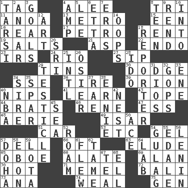 ACROSS 1. Label 4. Toward shelter 8. Three (prefix) 11. Small Philippine buffalo 13. Paris' subway 15. Car or cant ending 16. Rump 17. Stone: prefix 18. Monthly bill 19. Table seasonings 21. Viper 22. Inside; within (prefix) 23. Big collection agency 24. _ de Janeiro 27. Small drink 29. Metal containers 30. Evade 34. Compass dir. 36. Hoop that covers a wheel 39. Constellation of myth 40. Cuts off 41. Acquire or gain knowledge or skills 43. Drink excessively 44. Naughty children 46. French philosopher Descartes 47. Double-curved letter 48. Nest on high 49. Austrian river, tributary to the Danube 51. 4-wheeled motor vehicle 53. And so on (abbr.) 54. Set 57. Small valley 60. Often (poetically) 63. Evade 65. Mitch Miller's instrument 66. Having winglike extensions 69. Actor Alda or Thicke 70. Being at a high temperature 71. Klaipeda city 72. Indonesian resort city 73. Santa ___, CA 74. Welt 75. Commissioned military rank (abbr.) DOWN 1. Tarsus (plural) 2. Approach 3. Purposes of endeavors 4. Electrical Unit 5. Area sheltered from the wind 6. Singer James 7. Blunders 8. Adolescent 9. Tear apart 10. To the inside or interior of 12. Tate display 14. I made a mistake 18. News announcer 20. _ Lanka 25. International (abbr.) 26. Flexible twig of a willow tree 28. Wedding promise 29. One of the two male reproductive glands 31. "Vaya con ____" 32. Republicans 33. Compass dir. 34. Father 35. Coast Guard woman 37. Actress Charlotte 38. Bert's buddy 40. Basketball assoc. 42. A home for chicks 45. Ocean 50. Adept person 52. Wander aimlessly 54. POW camp 55. Peak District village in England 56. Soviet premier 1918-24 57. Capital of the state of Qatar 58. Inky black, to poets 59. Globular water bottle used in Asia 61. Soared 62. Docile 64. Experiment locale 67. Beverage made from leaves 68. Pipe bend