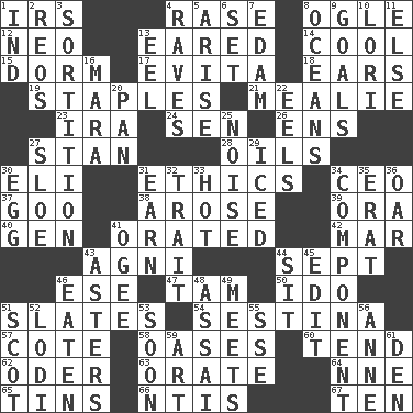 ACROSS 1. Big collection agency 4. To erase 8. Stare 12. Modern: prefix 13. Having ears or earlike features 14. Calm and collected 15. Dormintory (informal) 17. Webber/Rice musical 18. Hearing organs 19. Paper fasteners 21. Ear of corn 23. Lyricist Gershwin 24. Elected rep. 26. Followers of ems 27. Comedian Laurel of Laurel & Hardy 28. Petroleums 30. Biblical high priest 31. Principles of right and wrong 34. Corporate head (abbr.) 37. Thick or sticky substance 38. Came up 39. Mouth or opening 40. Commissioned mil. rank 41. Declaimed 42. Make imperfect 43. Hindu god of fire 44. Back-to-school mo. 46. Compass dir. 47. Scottish cap 50. Wedding promise 51. Chalkboards 54. French poetic form 57. ____ d'Azur (French Riviera) 58. Fertile tracts in a desert 60. Look after 62. Baltic tributary 63. Speak pompously 64. Compass dir. 65. Metal containers 66. Nuclear Threat Initiatives 67. Nine, plus one DOWN 1. Working for oneself (abbr.) 2. Vintage cars 3. Determination 4. All-night dance parties 5. Ascend 6. Put into a specified state 7. Dutch treat 8. Seas 9. Scores awarded for successful feats 10. Australian parrot (variant) 11. Otherwise 13. Snakelike fish 16. Hindu Mythology: god of death 20. Baking dish 22. Snakelike fish 25. Annoying sound 27. A type of plum 29. On the rocks 30. Ovum 31. Merit 32. Distinguishing feature 33. Being at a high temperature 34. Piece 35. Part of Q.E.F. 36. Boat paddle 41. Double curve, resembling the letter S 43. Michaelmas daisies 44. Be seated 45. Prepare for publication 46. Ingested 48. Slender Brazilian palm 49. Confronts 51. Native of Scotland 52. Farming town in central California 53. Within a short period 55. Compass dir. 56. Singer Murray 59. Tate display 61. Lair