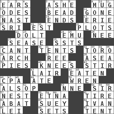 ACROSS 1. Hearing organs 5. American tennis player Robert 9. Java container 12. Lyric poems 13. Necklace unit 14. Went 15. Political cartoonist Thomas 16. Conclusions 17. One of the Great Lakes 18. Indian title of respect (Mr.) 19. Eastern Standard Time (abbr.) 21. Graphs 22. Dunce 24. Australian flightless bird 26. Born 27. Gospel singer Marvin 28. Fast planes 29. Patter 30. Portable shelters 32. "Corrida" creature 36. Bowlike part 37. To riddle 38. Toward the sea 39. Sliced desserts 40. Leg joints 42. Disorderly outburst 43. Den 44. Eroded 46. Accounting whiz (abbr.) 49. Had dinner 50. Songbird 51. Columnist Joseph or Stewart 53. Compass dir. 54. Title for a knight 57. A home for chicks 58. Inactive volcano in Sicily 61. Become fatigued 62. Blind as ____ 63. Chop _ 64. "Terrible" tsar 65. Luau accessory 66. Arranges properly for use 67. Portable shelter DOWN 1. Immeasurably long periods of time 2. The sixth month of the Jewish calendar 3. Home 4. Fast jet (abbr.) 5. Collude with 6. Elected rep. 7. Possessed 8. Begley and Asner 9. Person of subnormal intelligence 10. Join together 11. Honkers 14. Set 19. Raised railways 20. Proofreading order 21. Festering 23. Profane or obscene expressions 24. First name in cosmetics 25. Mountains (abbr.) 27. Indian skirt 28. Contemptuous expression 29. Head covering 31. Bert's buddy 32. Clothes sense 33. Clearly or manifestly demonstrative 34. It's straight from the horse's mouth 35. Boat paddle 40. Krazy ___ of comics 41. Stitched 43. Pet locale 45. "We ___ not amused" (Victoria) 46. Lessep's creation 47. First-year military academy student 48. Slender Brazilian palm 52. Baseball player Mel 53. Negative votes 55. SW Asia republic 56. Monthly bill 58. Double-curved letter 59. Third day of the wk. 60. Fish or hair follower 61. Teat (slang)