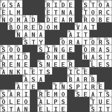 ACROSS 1. Girls' org. (abbr.) 4. Travel on or in a vehicle 8. Portico 12. Shade tree 13. Inactive volcano in Sicily 14. Torque (variant) 15. Wanderer 18. Letter starter 19. Loose flowing garment 20. Mood resulting from idleness 22. Large container 23. Grandmother 24. Small island 25. Filthy place 26. Speakers 30. "Barney Miller" actor Jack 33. Burn superficially 36. Mouths or openings 37. Among 39. Single 40. Political cartoonist Thomas 41. French philosopher Descartes 42. Scornful expression 44. French article 45. Short socks 47. Frozen water 50. White ___ sheet 51. Sharp remark 53. Had dinner 54. Heighten or intensify 57. Indian skirt 59. San ____ (Riviera town) 61. Theater features 63. Butter sub 64. High mountains 65. Third day of the wk. 66. Comedian Laurel of Laurel & Hardy 67. Writer Wiesel 68. Be seated DOWN 1. Commissioned military rank (abbr.) 2. Messy guy 3. ID or VA city 4. Redecorate 5. A whole individual unit 6. Heredity factor (abbr.) 7. Ewer handle 8. Ski resort town in Vermont 9. A blast of a horn 10. Globe 11. Adept person 16. Caspian sea tributary 17. Scratch 21. 24-hour periods 22. By way of 24. "We ___ not amused" (Victoria) 26. Double curve, resembling the letter S 27. Of the mouth 28. Raze (variant) 29. Fast planes 30. "Two Mules for Sister ____" 31. Sign of things to come 32. Pig sound 34. Charged atoms 35. Compass dir. 38. Conveyance 42. R.R. building 43. Teases 46. Compass dir. 48. Smile enhancers 49. One of the Great Lakes 52. Naughty children 53. Type of rug 54. Body of Kaffir warriors 55. Sense of smell 56. Needle case 57. Mayday 58. Keyboard modifier key 59. Actress Charlotte 60. Pipe bend 62. Put into a specified state
