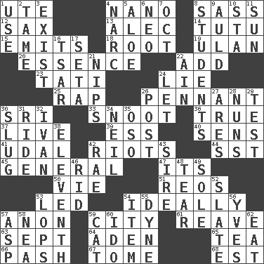 ACROSS 1. Shoshoni 4. Billionth: prefix 8. Backtalk 12. Saxophone 13. Actor Baldwin 14. Ballerina skirt 15. Sends forth 18. Carrot, for example 19. Uhlan (variant) 20. Core 22. Find the sum of 23. Jacques of French films 24. Whopper 25. Hit sharply and swiftly 26. Pre-World Series prize 30. _ Lanka 33. Snob 36. Loyal 37. Not recorded 39. Curvy letter 40. Elected reps. 41. Hereditary estate 42. Debaucheries 44. Fast jet (abbr.) 45. Commissioned military rank 47. ___ a Wonderful Life 50. Compete 51. Vintage cars 53. Directed 54. Under perfect conditions 57. Soon (poet.) 59. Municipality 61. Rob, plunder, or pillage 63. Back-to-school mo. 64. An important port of Yemen 65. Afternoon social gathering 66. Romantic infatuation 67. Heavy book 68. Eastern Standard Time (abbr.) DOWN 1. Purpose 2. Docile 3. Be extant 4. Drug cop 5. _ vera 6. Modern: prefix 7. Sep. follower 8. SAT takers 9. Old (Scot.) 10. R.R. building 11. Player for Phoenix 16. Russian ruler of old 17. Stalk of a moss capsule 21. Pinches, bites 22. The 18th letter of the Arabic alphabet 24. Allow 26. Mail 27. Ancient Greek god of war 28. Religious women 29. Trial 30. A hard, heavy blow 31. Travel on an animal 32. "Terrible" tsar 34. Famous astronaut Armstrong 35. Bear (Spanish) 38. Veterans Day date 42. Actress Charlotte 43. Title for a man of rank and authority 46. To free from 48. Lacerate 49. Flatfish 52. Chalkboard 53. Chops off 54. Detail 55. Unit of force 56. Jacques Cousteau's middle name 57. Cleo's killer 58. Teachers' org. 59. Feline 60. Wedding promise 62. Ingest