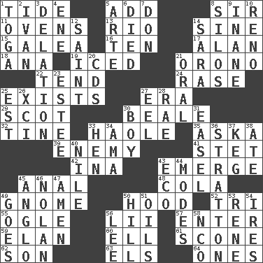 ACROSS 1. Periodic rise and fall of the sea level 5. Increase 8. Title for a knight 11. Baking chambers 13. _ de Janeiro 14. Trig term 15. An organ shaped like a helmet 16. Nine, plus one 17. Actor Alda or Thicke 18. Santa ___, CA 19. On the rocks 21. U. of Maine site 22. Look after 24. Raze (variant) 25. Is extant 27. Period 29. Native of Scotland 30. Memphis, Tenn. Street 32. Prong on a fork 33. White Person, in Hawaii 35. "____ silly question..." 39. Foe 41. Proofreading order 42. _ tizzy (2 wds.) 43. Develop 45. Of or related to the anus 48. Root beer relative 49. Dwarf 50. Parka part 52. Three (prefix) 55. Stare 56. Cards in a Roman deck? 57. Keyboard key 59. Flair 60. Pipe bend 61. Biscuitlike quick bread 62. Boy, to dad 63. Raised railways 64. Washington bills DOWN 1. Ancient Roman robe 2. _ the terrible 3. Accusation by an informer 4. Compass dir. 5. Johnson of "Laugh-In" 6. Passed on 7. Spanish title 8. Grain storage towers 9. Silly 10. Western Nevada city 12. Inhabitant of Heaven 14. "Two Mules for Sister ____" 20. Music discs 21. Of the mouth 23. First name in cosmetics 25. Eastern Standard Time (abbr.) 26. One more than ninety 27. Snakelike fish 28. Actress Charlotte 30. Male child 31. Artist's stand 33. Layer 34. Housemaid (var.) 36. Ski resort town in Vermont 37. Barrel 38. Had dinner 40. The longest river in the world 43. Environmental prefix 44. Methods 45. White American of non-Hispanic descent 46. Pitcher Ryan 47. So be it 49. Travels 50. Land elevation 51. Petroleums 53. French philosopher Descartes 54. Angers 56. Area sheltered from the wind 58. Non-commissioned officer (abbr.)