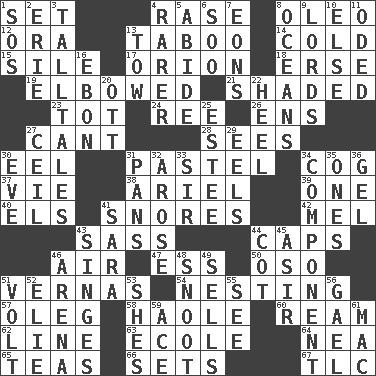 ACROSS 1. Put into a specified state 4. To erase 8. Margarine 12. Mouth or opening 13. Off limits 14. Having a low temperature 15. Filth; sediment 17. Constellation of myth 18. Celtic language 19. Shoved, as through a crowd 21. Cast a shadow over 23. Small child 24. To riddle 26. Followers of ems 27. Patter 28. Perceives with the eye 30. Snakelike fish 31. Soft color 34. Gear tooth 37. Compete 38. Satellite of Uranus 39. Single 40. Raised railways 41. Sounds asleep 42. Cartoonist voice _ Blanc 43. Backtalk 44. Balmoral and tarboosh 46. Atmosphere 47. Double-curved letter 50. Bear (Spanish) 51. Actresses Bloom and Felton 54. Snuggling 57. Cassini of fashion 58. White Person, in Hawaii 60. 480, 500 or 516 sheets of paper 62. Actor's bit 63. Learning spot: Fr. 64. Teachers' org. 65. Afternoon social gatherings 66. Arranges properly for use 67. Affectionate concern, for short DOWN 1. Distress signal 2. One of the Great Lakes 3. Baron Munchausen's specialties 4. Less widely known 5. Tolerate 6. "Barney Miller" actor Jack 7. Immeasurably long periods of time 8. Seas 9. Titled peers of a realm 10. Otherwise 11. Wrote a lyric poem 13. Pull behind 16. Inky black, to poets 20. Baseball player Mel 22. The bottom of a shoe or boot 25. First name in cosmetics 27. To provide with a ceiling 29. Snakelike fish 30. Night before a holiday 31. Baking dishes 32. Came up 33. Title for a knight 34. Piece 35. Washington bills 36. Set 41. "Two Mules for Sister ____" 43. Scorches 44. Small bed 45. SW Saudi Arabia district 46. Sports stadium 48. Snout, nose 49. Exchanges for money 51. Electrical Unit 52. Writer Wiesel 53. "______ My Girl" (Turtles hit) 55. Observe 56. Highlander 59. Adept person 61. Apple computer (short form)
