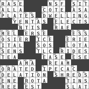 ACROSS 1. To erase 5. Science/research agcy. 8. Be seated 11. Silent film actress Nazimova 12. ____ d'Azur (French Riviera) 13. White ___ sheet 14. Food holders 17. Residence 19. Gossips 21. Opts 22. Nuclear Threat Initiatives 23. Actress Charlotte 24. Cartoonist voice _ Blanc 27. Celtic language 29. Curvy letter 32. Flexible twig of a willow tree 34. Frozen water 36. 4th largest of the Great Lakes 37. Slanted text style (abbr.) 38. Distress signal 39. Globular water bottle used in Asia 40. Elected reps. 41. Affectionate concern, for short 42. Amusement-park features 43. Beverage made from leaves 44. Comfort 46. Compass dir. 47. Wet nurse (var.) 50. 480, 500 or 516 sheets of paper 52. Declaimed 55. Medicinal drug used to evoke vomiting 57. Accusation by an informer 59. Fragments 62. Compass dir. 63. Round or rotation of duties 64. Airtight sealed metal containers 65. To separate or throw off 66. Eastern Standard Time (abbr.) 67. Narrow board DOWN 1. Reproach for some lapse or misdeed 2. 100% 3. Kill 4. Consumed 5. Immediately 6. Navigate 7. Man or boy (slang) 8. Ketch in the Levant 9. Is not 10. Labels 12. Music discs 15. Keyboard key 16. Use a spoon 18. Area sheltered from the wind 20. Help 24. Wet 25. First name in cosmetics 26. Woody, climbing, usually tropical plant 28. Learning spot: Fr. 29. Wear away 30. Locates 31. Gospel singer Marvin 33. Raised railways 35. Fortification 36. Biblical high priest 42. Arrive at 45. Observes 47. "One Day ___ Time" 48. Distance measurement (Brit.) 49. Goodbye (Sp.) 51. Shops 52. River in Europe 53. French philosopher Descartes 54. Toward shelter 55. _ tizzy (2 wds.) 56. To provide with a ceiling 58. Baseball player Mel 60. Heredity factor (abbr.) 61. Fast jet (abbr.)