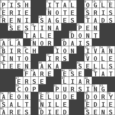 ACROSS 1. Expression of disdain 5. Slanted text style (abbr.) 9. Stare at amorously 13. 4th largest of the Great Lakes 14. Musical sound 15. Indian titles of respect 16. Painter Guido (1575-1642) 17. Gurus 18. Small amounts or degrees 19. French poetic form 21. Fenced enclosure 22. Story 23. Do not 24. In the manner of 27. Not either 28. Raised platform 29. A tree used for making furniture 31. Electrically charged atom 32. _ the terrible 36. To the inside or interior of 37. Big collection agency 38. Grand slam 39. Adolescent 40. Alias (abbr.) 41. Exchanges for money 42. Conductor's collection 44. Compass dir. 46. Make lace 47. Celtic language 48. One who doesn't tell the truth 50. Police officer (slang) 51. Puckering 54. Period of immesurable duration 56. Evade 58. Small, narrow, flatbottom fishing boat 60. Table seasoning 61. "Death on the ____" 62. Singer Brickell 63. Ancient Greek god of war 64. Passed on 65. Elected reps. DOWN 1. For each 2. Angers 3. Trig term 4. Robbery 5. More lacking in sense or substance 6. Ancient Roman robe 7. Had dinner 8. French article 9. Clearly or manifestly demonstrative 10. Monetary aid 11. Flaplike covering 12. Double-curved letter 17. Grain storage tower 20. Hyperbolic tangent 21. Luau course 23. Daniel's nick name 24. "This won't hurt ____!" 25. Actor's bit 26. Johnson of "Laugh-In" 28. Two (Sp.) 30. Meets 31. Lyricist Gershwin 33. Electrical Unit 34. Silent film actress Nazimova 35. Egg locale 37. Mamie's mate 40. "We ___ not amused" (Victoria) 41. Oceans 43. Viper 44. Dodged 45. Male parent of an animal 47. Learning spot: Fr. 49. Amusement-park features 51. Whine 52. Connecting point 53. Amused look 54. White ___ sheet 55. Ewer handle 56. Conclude 57. Cards in a Roman deck? 59. Affirmative reply