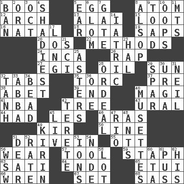 ACROSS 1. Scornful sounds 5. Ovum 8. Smallest unit of an element 12. Bowlike part 13. Jai ____ 15. Plunder 16. Brizilian seaport 18. Roll call or roster of names 19. Plant excrements 20. Two (Sp.) 22. Modes 24. South American Indian 26. Hit sharply and swiftly 27. Armor plate that protects the chest 28. Petroleum 29. Player for Phoenix 32. Bar bills 35. Torque (variant) 37. Before (prefix) 38. Collude with 39. Conclude 40. Wise men 41. Basketball assoc. 42. Family _ (genealogy) 43. Mountain range 44. Possessed 45. French article 46. Caspian sea tributary 49. Apertif with cassis 50. Actor's bit 51. Popular '50s hangout 55. Baseball player Mel 56. Put on (as clothing) 57. Implement 59. Staphylococcus 63. Suttee (variant) 64. Inside; within (prefix) 65. Needle case 66. Songbird 67. Put into a specified state 68. Backtalk DOWN 1. Prohibit 2. Mouth or opening 3. Sep. follower 4. Most dark, concealed or hidden 5. Ewer handle 6. Seize upon or latch onto something 7. Yard entry 8. Columnist Joseph or Stewart 9. Frog relative 10. I made a mistake 11. Mountains (abbr.) 14. Of or pertaining to medicine 17. Protracted 21. _-fi 23. Actor Linden 25. Michaelmas daisies 28. Severe or trying experience 29. Practice fight 30. Capital and largest city of Mongolia 31. Famous astronaut Armstrong 32. Hyperbolic tangent 33. Swedish rock group 34. Necklace unit 36. Single 40. French bagpipes 42. Cylindrical with tapered ends 45. 54 in ancient Rome 47. River (Sp.) 48. Pismires 49. Japanese brewing company 51. Letter starter 52. Pace 53. Charged particles 54. Thickened enlargement 56. Compass dir. 58. Car dealer's back yard 60. _ moment's notice (2 wds.) 61. Tenth month of the Hindu calendar 62. Part of HMS, perhaps