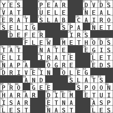 ACROSS 1. It is so 4. Lightbulb-shaped fruit 8. Movie discs 12. Large container 13. Ubangi River tributary 14. Anneal 15. Part of Q.E.F. 17. Thick slice 18. Capital of Egypt 19. Major League Baseball Commissioner Bud 21. Health resort 23. Fish or hair follower 24. Put off 26. Big collection agency 28. Soared 30. Modes 34. Make lace 37. Nathan's nickname 39. Armor plate that protects the chest 40. Biblical high priest 41. Feeling or showing extreme anger 43. Allow 44. California wine valley 46. Legendary monster 47. Begley and Asner 48. Popular '50s hangout 51. Cassini of fashion 54. Added to 55. Narrow boards 58. Adept person 61. Turn to the right 63. Soup utensil 65. Ethiopian city, capital of Harari 67. South Vietnam president (1954) 71. Needle holder 72. Austrian river, tributary to the Danube 73. Inactive volcano in Sicily 74. Viper 75. For fear that 76. Political cartoonist Thomas 77. French article DOWN 1. Jacques Cousteau's middle name 2. Having ears or earlike features 3. Lacking originality or spontaneity 4. Festering 5. Snakelike fish 6. In the manner of 7. Confederate soldiers (slang) 8. Heredity factor (abbr.) 9. Distinctive style or manner 10. Have the gumption 11. Position in a hierarchy or organization 16. Small quarrel 18. Haul 20. Set 22. Sliced dessert 25. Painter Guido (1575-1642) 27. A female animal or person 29. Make _____ (do battle with) 30. Paris' subway 31. Stare at amorously 32. Passed on 33. Fast planes 34. Be inclined (to) 35. Having or resembling wings 36. Native american tent (variation) 38. Label 42. Snakelike fish 45. Actress Gardner 49. Engineer (abbr.) 50. Binary compound 52. Raised railways 53. Stare wonderingly 56. Add up to 57. Boozer 58. Silvers or Donahue 59. Raze (variant) 60. Mouths or openings 62. Locale of original sin 64. Cuts off 66. Nonscientific branch of learning 68. Call ___ day 69. Followers of ems 70. Floor protector