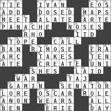 ACROSS 1. Make a knot 4. "Terrible" tsar 8. Greek goddess of the dawn 11. Find the sum of 12. Administered medicine 14. Atlas contents 15. Confront 17. Having winglike extensions 18. Johnson of "Laugh-In" 19. Flamboyance 21. Olfactory organs 23. 17th letter of the Greek alphabet 24. It would 25. Drink excessively 27. Give a ring to 30. Bar 31. Full of chinks, cracks, or crevices 34. Epoch 37. Curve 38. Receives possession of 39. "___ Little Indians" 40. Had dinner 41. Cause to be 43. Corn or form start 44. "______ My Girl" (Turtles hit) 45. Put down 47. Armed conflict 49. _ Mahal 50. Homeless child 52. Legislator 56. Old wives' tales, e.g. 57. Motion picture award 60. Hero or heavy, e.g. 61. At once, immediately (arch.) 62. Erodes 63. 100% 64. Benjamin's nick name 65. One of the Great Lakes 66. 24 hours DOWN 1. Pack (down) 2. It may be bright or harebrained 3. Locale of original sin 4. Potato state 5. Short-tailed, large-bodied rat 6. White ___ sheet 7. Fish or hair follower 8. Having ears or earlike features 9. Chooses 10. Compass dir. 13. Lair 14. Vertical spar for supporting sails 16. Canvas cover 20. "Mermaids" star 22. Lubricate 25. Small pie 26. Single time 27. Popular sodas 28. At sea 29. For fear that 30. Sound made by sheep 32. Hankering 33. Female horse 34. Needle case 35. Tear apart 36. Cuckoo 42. Enthusiasm 44. _ Lanka 46. Partly open 47. Make _____ (do battle with) 48. So be it 49. Laconic 50. Went 51. Immediately 52. Indian skirt 53. Frog relative 54. Water jar 55. Have trust in 56. Experiment locale 58. Observe 59. 4-wheeled motor vehicle