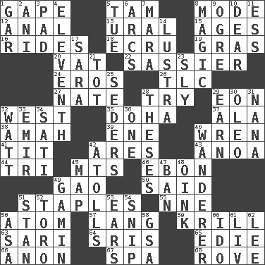 ACROSS 1. Yawn 5. Scottish cap 8. Method 12. Of or related to the anus 13. Mountain range 15. Matures 16. Amusement-park features 18. Shade of tan 19. Pate de foie ____ 20. Large container 22. More lively and spirited 24. Greek god of love 26. Affectionate concern, for short 27. Nathan's nickname 28. Attempt 29. Age 32. Compass direction 35. Capital of the state of Qatar 37. Chicken ___ king 38. Nursemaid 39. Compass dir. 40. Songbird 41. Teat (slang) 42. Ancient Greek god of war 43. Small Philippine buffalo 44. Three (prefix) 45. Mountains (abbr.) 46. Inky black, to poets 49. E Mali city 50. Expressed in words 51. Paper fasteners 55. Compass dir. 56. Tiny particle 57. Austrian-born American filmmaker Fritz 59. Shrimp-like planktonic crustaceans 63. Indian skirt 64. Indian titles of respect 65. Singer Brickell 66. At once, immediately (arch.) 67. Health resort 68. Be footloose DOWN 1. Slender fish 2. Cuckoo 3. Groovy apt. 4. Veterans Day date 5. Third day of the wk. 6. Curves 7. Hindu Mythology: god of death 8. Mysterious quality of enchantment 9. Legendary monster 10. Letter starter 11. Curvy letter 14. A period of five years 17. "Two Mules for Sister ____" 21. Small child 23. Stealthy 25. Spring feasts 28. College papers 29. Merit 30. Butter sub 31. Nanny 32. Electrical Unit 33. Arab leader 34. Suttee (variant) 36. Single 40. Nomad 42. Ringlike coral islands and reefs 45. Atlas unit 47. Forbid 48. Pig sound 49. Homeless child 51. Comedian Laurel of Laurel & Hardy 52. "Corrida" creature 53. Hearing organs 54. Clip 56. White ___ sheet 58. Girls' org. (abbr.) 60. Wedding promise 61. 54 in ancient Rome 62. Area sheltered from the wind