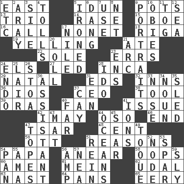 ACROSS 1. Compass direction 5. Goddess of spring and wife of Bragi 9. Plant holders 13. Musical group of three 14. To erase 15. Mitch Miller's instrument 16. Give a ring to 17. Music written for nine 18. Port city in Latvia 19. Crying or shouting loudly 21. Had dinner 22. Not divided or shared with others 23. Blunders 24. Raised railways 27. Directed 28. South American Indian 29. Brizilian seaport 31. Begley and Asner 32. Taverns 36. "Vaya con ____" 37. Corporate head (abbr.) 38. Implement 39. Mouths or openings 40. Avid follower 41. Come out of 42. "If ____ say so..." 44. Bear (Spanish) 46. Conclude 47. Russian ruler of old 48. Penny 50. Baseball player Mel 51. Thinks logically 54. Dad 56. Approach 58. I made a mistake 60. So be it 61. Chow _ 62. Hereditary estate 63. Political cartoonist Thomas 64. Baking dishes 65. Suggestive of the supernatural DOWN 1. And so on (abbr.) 2. Like ___ of sunshine 3. Filth; sediment 4. For Whom the Bell _____ 5. Pressed 6. Mild oath, euphamism for damn 7. Purpose 8. Fish or hair follower 9. Likenesses of persons 10. Off-Broadway awards 11. Coat; cloak 12. Ocean 17. The longest river in the world 20. Hang loosely or laxly 21. Curve 23. Followers of ems 24. Inside; within (prefix) 25. Den 26. Portico 28. Wedding promise 30. Aide 31. Car or cant ending 33. Sense of smell 34. Part of speech 35. Downhill vehicle 37. Island 40. Distant 41. Charged particles 43. Floor protector 44. Seas 45. Scorch 47. Drinks excessively 49. Woman's close-fitting hat 51. It's straight from the horse's mouth 52. Thickened enlargement 53. Practice fight 54. Baking dish 55. Nursemaid (var.) 56. Electrical Unit 57. Teachers' org. 59. Secret