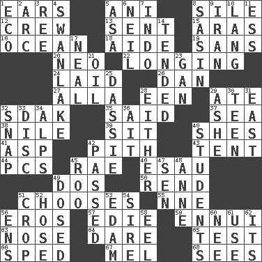ACROSS 1. Hearing organs 5. Cuckoo 8. Filth; sediment 12. Ship's personnel 13. Posted 15. Ancient river in northeast Turkey 16. Sea 18. Helper 19. Without 20. Modern: prefix 22. Yearning 24. Put down 26. Daniel's nick name 27. Silent film actress Nazimova 28. Car or cant ending 29. Had dinner 32. Neighbor of Neb. 35. Alleged 37. Ocean 38. "Death on the ____" 39. Be seated 40. "______ My Girl" (Turtles hit) 41. Viper 42. Heart or essence 43. Portable shelter 44. Personal Computers (abbr.) 45. Actress Charlotte 46. He sold his birthright 49. Two (Sp.) 50. Tear apart 51. Opts 55. Compass dir. 56. Greek god of love 57. Singer Brickell 59. World-weariness 63. Characteristic smell of wine 64. Have the gumption 65. Trial 66. Drove too fast 67. Cartoonist voice _ Blanc 68. Observes DOWN 1. Environmental prefix 2. Curve 3. To riddle 4. Tchaikovsky ballet 5. White ___ sheet 6. Famous astronaut Armstrong 7. _ china 8. Indian antelope 9. SW Asia republic 10. Long (Scottish) 11. Double-curved letter 14. Looked after 17. Be tempered by heat 21. Petroleum 23. Separate the seeds from cotton 25. Hyrax 28. One or the other 29. American tennis player Robert 30. Adolescent 31. 90 degrees 32. Fastener 33. Compact _ 34. High mountains 36. Small island 40. SAT takers 42. Went by 45. Friend of Pooh 47. Elected rep. 48. Queen of England 1702-14 49. Administered medicine 51. Riding implement 52. Stockings 53. Dutch treat 54. Father 56. Followers of ems 58. Snakelike fish 60. Born 61. Purpose 62. ___ a Wonderful Life