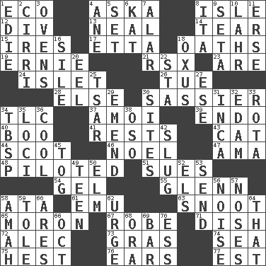 ACROSS 1. Environmental prefix 4. "____ silly question..." 8. Capri or Wight 12. HTML Container Element 13. Be tempered by heat 14. Separate forcefully 15. Angers 17. Singer James 18. Curses 19. Bert's buddy 21. Acura sports coupe 23. "We ___ not amused" (Victoria) 24. Small island 26. Third day of the wk. 28. Otherwise 30. More lively and spirited 34. Affectionate concern, for short 37. Mine, in Marseilles 39. Inside; within (prefix) 40. Sometimes accompanies a hiss 41. Musical pauses 43. Domesticated feline 44. Highlander 46. Christmas carol 47. Nanny (var.) 48. Manned the helm 51. Takes to court 54. Set 55. American astronaut and politician John 58. "One Day ___ Time" 61. Australian flightless bird 63. Snout, nose 65. Person of subnormal intelligence 67. Loose flowing garment 71. Food container 72. Actor Baldwin 73. Pate de foie ____ 74. Ocean 75. Behest 76. Hearing organs 77. Eastern Standard Time (abbr.) DOWN 1. Singer Brickell 2. High-altitude cloud 3. Baking chambers 4. One (Scot) 5. Put into a specified state 6. Krazy ___ of comics 7. Having or resembling wings 8. Call ___ day 9. Stalk of a moss capsule 10. Cowardly lion portrayer 11. Celtic language 16. Filth; sediment 18. The longest river in Central Asia 20. Snakelike fish 22. R.R. building 25. Russian ruler of old 27. Compass dir. 29. Make improvements or corrections to 30. Settings 31. South American Indian 32. Dutch treat 33. Roll call or roster of names 34. Cook's measure (abbr.) 35. Event scenes 36. Calm and collected 38. Bear (Spanish) 42. Strike heavily 45. Coat; cloak 49. Adolescent 50. Shade tree 52. Raised railways 53. Transmit 56. Annoying sound 57. Olfactory organs 58. Housemaid 59. Lacquered or enameled metalware 60. Ancient Greek god of war 62. Goad 64. Not this but _ 66. Sep. follower 68. Mouth or opening 69. Long, evenly shaped piece 70. Curvy letter