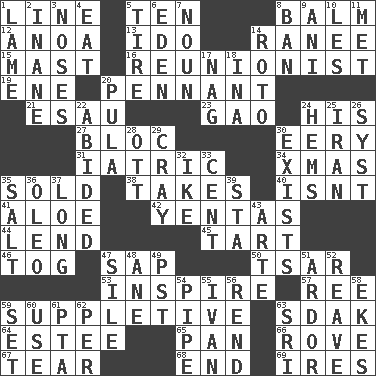 ACROSS 1. Actor's bit 5. Nine, plus one 8. Lip ointment 12. Small Philippine buffalo 13. Wedding promise 14. Indian princess (variant) 15. Vertical spar for supporting sails 16. One who advocates reunion 19. Compass dir. 20. Pre-World Series prize 21. Son of Isaac 23. E Mali city 24. Part of HMS, perhaps 27. Alliance 30. Suggestive of the supernatural 31. Of or pertaining to medicine 34. Dec. holiday 35. Exchanged or delivered for money 38. Proceeds 40. Is not 41. Medicinal plant 42. Gossips 44. Grant temporary use of 45. Small pie 46. Coat; cloak 47. Plant excrement 50. Russian ruler of old 53. Motivate 57. Portuguese money of account (variant) 59. Supplementary 63. Neighbor of Neb. 64. First name in cosmetics 65. Baking dish 66. Be footloose 67. Pull into pieces 68. Conclusion 69. Angers DOWN 1. Unable to walk 2. Silly 3. Olfactory organs 4. Ingest 5. Hoop that covers a wheel 6. Genesis locale 7. Part of speech 8. Forbid 9. Black tropical American cuckoo 10. French article 11. Was introduced to 14. Printing process, for short 17. Tired old horse 18. _ tizzy (2 wds.) 20. Monetary unit of Botswana 22. Stayed 24. Equivocates 25. SW Asia republic 26. System (abbr.) 28. Baseball player Mel 29. Supercomputer manufacturer 30. Is 32. Eisenhower's nickname 33. Penny 35. Table seasoning 36. Butter sub 37. Yearn 39. R.R. building 43. Johnson of "Laugh-In" 47. Filth; sediment 48. One (Scot) 49. Pacific Standard Time (abbr.) 51. Zeal 52. Break or tear apart 54. Corncob 55. "Terrible" tsar 56. Tear apart 58. Supplements with great effort 59. Arrange properly for use 60. Purpose 61. Parent Teacher Assoc. 62. For each 63. Indian title of respect (Mr.)