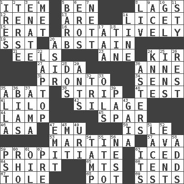 ACROSS 1. A distinct part 5. Benjamin's nick name 8. Fails to keep up a pace 12. French philosopher Descartes 13. "We ___ not amused" (Victoria) 14. It is permitted: Lat. 15. Part of Q.E.F. 16. Happening in regular succession 19. Fast jet (abbr.) 20. Refrain by choice 21. Snakelike fish 23. A saturated hydrocarbon 24. Apertif with cassis 27. Opera by Verdi 30. Queen of England 1702-14 31. Right away 34. Elected reps. 35. Blind as ____ 38. Long narrow piece of something 40. Trial 41. _ and Stitch 42. Fodder prepared in a silo 44. Desk light 45. Coast Guard woman 46. White ___ sheet 47. Australian flightless bird 50. Capri or Wight 53. Chrissie's court nemesis 57. Actress Gardner 59. Appease 63. On the rocks 64. Chest covering 65. Mountains (abbr.) 66. Watch over 67. Lacquered or enameled metalware 68. Cooking vessel 69. Fast planes DOWN 1. Angers 2. Laconic 3. Maternal 4. Was introduced to 5. Sharp remark 6. Greek god of love 7. Remaining after all deductions 8. 54 in ancient Rome 9. Adept person 10. Set 11. Filthy place 14. Actor's bit 17. American Automobile Association (abbr.) 18. Shallow baking pan 20. SW Saudi Arabia district 22. Portable computer 24. Leg joint 25. Lodging establishments 26. Relief 28. Two (Sp.) 29. Pismires 30. Michaelmas daisies 32. Three (prefix) 33. Petroleums 35. Silent film actress Nazimova 36. Prejudice 37. _ mater 39. Infant food 43. Greek goddess of the earth (variant) 47. Send forth 48. Floor covering 49. RI univ. 51. Shoestrings 52. Incident 54. Pack (down) 55. "Tell ____ the Marines!" 56. A home for chicks 58. Does sums 59. Pacific Standard Time (abbr.) 60. 17th letter of the Greek alphabet 61. Lubricate 62. Before (prefix) 63. ___ a Wonderful Life