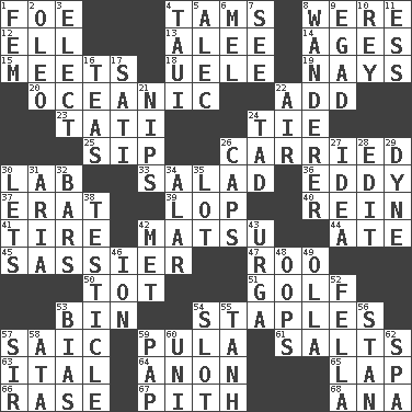 ACROSS 1. Enemy 4. Scottish caps 8. Past tense of be (plural) 12. Pipe bend 13. Toward shelter 14. Grows older 15. Confronts 18. Ubangi River tributary 19. Negative votes 20. Pertaining to the sea 22. Say or write further 23. Jacques of French films 24. Neckwear 25. Small drink 26. Borne 30. Experiment locale 33. First course 36. Whirlpool 37. Part of Q.E.F. 39. Trim (branches) 40. It's straight from the horse's mouth 41. Hoop that covers a wheel 42. Taiwanese island in East China Sea 44. Had dinner 45. More impudent 47. Friend of Pooh 50. Small child 51. Eighteen holes 53. Storage container 54. Paper fasteners 57. Ketch in the Levant 59. Monetary unit of Botswana 61. Table seasonings 63. Slanted text style (abbr.) 64. At once, immediately (arch.) 65. Infant locale 66. To erase 67. Heart or essence 68. Santa ___, CA DOWN 1. Opposite of masc. 2. Margarine 3. Opt 4. "Change" in Tahitian 5. Actor Baldwin 6. Cartoonist voice _ Blanc 7. Perceive with the eye 8. Roamer 9. Mild oath 10. Marina Del _, California 11. Double-curved letter 16. Afternoon social gatherings 17. Suttee (variant) 21. Cuts off 22. Atmosphere 24. Bit 26. Balmoral and tarboosh 27. It may be bright or harebrained 28. Prepare for publication 29. Unit of force 30. Allows 31. Roberta Peters solo 32. Oblong pieces of solid material 34. Having or resembling wings 35. Car dealer's back yard 38. One of the two male reproductive glands 42. Was introduced to 43. Capital and largest city of Mongolia 46. Electrically charged atom 48. I made a mistake 49. Spanish pot 52. Chap (slang) 53. Prejudice 54. Position in a hierarchy or organization 55. Hyperbolic tangent 56. Comedian Laurel of Laurel & Hardy 57. Title for a knight 58. _ moment's notice (2 wds.) 59. Infant food 60. Corn or form start 62. Health resort