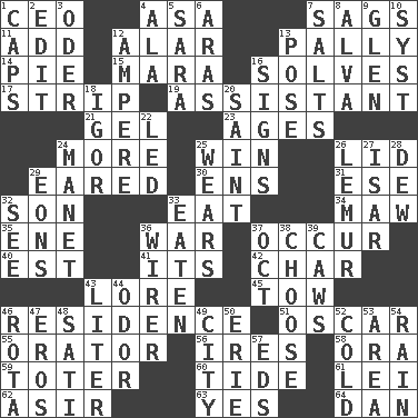 ACROSS 1. Corporate head (abbr.) 4. White ___ sheet 7. Settles 11. Say or write further 12. Having or resembling wings 13. Friendly 14. Sliced dessert 15. Hindu Mythology: god of death 16. Finds the solution 17. Remove all contents or possession from 19. Helper 21. Set 23. Matures 24. Greater amount 25. Victory 26. Hat (slang) 29. Having ears or earlike features 30. Followers of ems 31. Compass dir. 32. Male offspring 33. Erode 34. Informal term for the mouth 35. Compass dir. 36. Armed conflict 37. Come to pass 40. Eastern Standard Time (abbr.) 41. ___ a Wonderful Life 42. Burn to charcoal 43. Old wives' tales, e.g. 45. Pull behind 46. Dwelling 51. Motion picture award 55. Speaker 56. Angers 58. Mouth or opening 59. Carrier 60. Periodic rise and fall of the sea level 61. Flowery wreath 62. SW Saudi Arabia district 63. Consenting reply 64. One of the 12 tribes of Israel DOWN 1. Smile enhancers 2. Prepare for publication 3. River in Europe 4. Wing 5. "Two Mules for Sister ____" 6. Caspian sea tributary 7. Table seasonings 8. Inventor's middle name 9. Small, secluded valley 10. System (abbr.) 12. Electrical Unit 13. Introduce or present, as a question 16. Public displays of written messages 18. Composer Stravinsky 20. Virtuous person 22. Directed 24. French painter Edouard 25. Puts on (as clothing) 26. Arboreal primate 27. Austrian river, tributary to the Danube 28. Morning condensation 29. Immeasurably long periods of time 32. Perceive with the eye 33. Consumed 36. One who wires 37. Sep. follower 38. Elect 39. Crow sounds 43. 61 cubic inches 44. Aroma 46. Round or rotation of duties 47. Greek god of love 48. Suttee (variant) 49. Municipality 50. 4th largest of the Great Lakes 52. Having a low temperature 53. Length times width 54. Precipitation 57. Begley and Asner