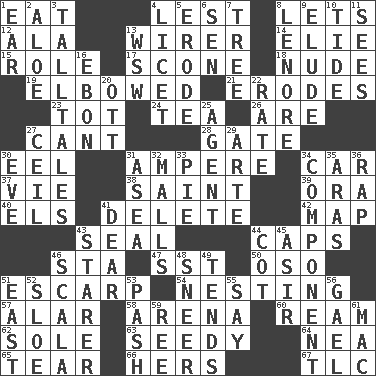 ACROSS 1. Erode 4. For fear that 8. Allows 12. In the manner of 13. One who wires 14. Writer Wiesel 15. Hero or heavy, e.g. 17. Biscuitlike quick bread 18. Naked 19. Turned at an angle; bent 21. Eats (away) 23. Small child 24. Afternoon social gathering 26. "We ___ not amused" (Victoria) 27. Patter 28. Yard entry 30. Snakelike fish 31. Electrical Unit 34. 4-wheeled motor vehicle 37. Compete 38. Inhabitant of Heaven 39. Mouth or opening 40. Raised railways 41. Keyboard key 42. Atlas unit 43. Lick closed 44. Smile enhancers 46. R.R. building 47. Fast jet (abbr.) 50. Bear (Spanish) 51. Fortification 54. Inhabiting a nest 57. Having or resembling wings 58. Sports stadium 60. 480, 500 or 516 sheets of paper 62. Not divided or shared with others 63. Shabby and untidy 64. Teachers' org. 65. Separate forcefully 66. Possessive pronoun 67. Affectionate concern, for short DOWN 1. Hearing organ 2. _ vera 3. Baron Munchausen's specialties 4. It is permitted: Lat. 5. Eat (away) 6. Elected rep. 7. Woody plant 8. Poe poem 9. Dodge 10. Event that recurs at intervals 11. Observes 13. Compass dir. 16. Inky black, to poets 20. Baseball player Mel 22. Pace 25. Representative 27. To provide with a ceiling 29. Johnson of "Laugh-In" 30. Night before a holiday 31. At sea 32. Shopping centers 33. Sliced dessert 34. Part 35. Caspian sea tributary 36. Hit sharply and swiftly 41. Letter starter 43. A viewer who gazes fixedly 44. Small bed 45. SW Saudi Arabia district 46. Any of the three canals of the cochlea 48. Scornful expression 49. Looks after 51. Compass direction 52. _ gin 53. Romantic infatuation 55. Declare 56. Highlander 59. To separate or throw off 61. Big _
