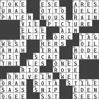 ACROSS 1. Puff or smoke 5. Compass dir. 8. Ancient Greek god of war 12. Mountain range 13. "Beetle Bailey" pooch 15. Ubangi River tributary 16. Eucharist need 18. Common sense 19. Precipitation 20. Compete 22. Photo 24. Otherwise 26. Direct toward a target or goal 27. Remaining after all deductions 28. The grampus (Milton) 29. Label 32. 270 degrees 35. Possessive pronoun 37. Lubricate 38. Wet nurse 39. Lyricist Gershwin 40. Method 41. Teat (slang) 42. Scram! 43. ____ Bator 44. Three (prefix) 45. French article 46. Singles 49. To free from 50. Be footloose 51. Popular '50s hangout 55. Dripping 56. NW Algerian seaport 57. Round or rotation of duties 59. Vertical member of a panel or frame 63. Backtalk 64. Sever or remove by pinching or nipping 65. Paradise 66. Double curve, resembling the letter S 67. Fast jet (abbr.) 68. Observes DOWN 1. Uncastrated adult male sheep 2. Mouth or opening 3. Krazy ___ of comics 4. Veterans Day date 5. A really long time 6. Halt 7. Needle case 8. Gold (Symbol: Au) 9. Hitchcock's "____ Window" 10. Writer Wiesel 11. Elected rep. 14. Motion picture awards 17. Mediterranean tributary 21. Eastern Standard Time (abbr.) 23. Nervous spasm 25. Principles of right and wrong 28. Speaker 29. Utensil 30. Opera by Verdi 31. Small, secluded valley 32. Electrical Unit 33. Independent ruler or chieftain 34. Suttee (variant) 36. Period 40. French bagpipes 42. Spring feasts 45. 54 in ancient Rome 47. At this time 48. Nights before holidays 49. Wash lightly 51. To draw with force 52. To erase 53. Charged atoms 54. Nuclear Threat Initiatives 56. Bear (Spanish) 58. Fitting 60. Binary compound 61. Area sheltered from the wind 62. Followers of ems
