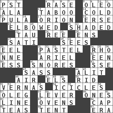 ACROSS 1. Pacific Standard Time (abbr.) 4. Raze (variant) 8. Margarine 12. Wing 13. Off limits 14. Lacking warmth 15. Monetary unit of Botswana 17. Constellation of myth 18. Celtic language 19. Turned at an angle; bent 21. Cast a shadow over 23. The 19th letter of the Greek alphabet 24. Portuguese money of account (variant) 26. Followers of ems 27. Suttee (variant) 28. Perceives with the eye 30. Snakelike fish 31. Soft color 34. 17th letter of the Greek alphabet 37. Compass dir. 38. Satellite of Uranus 39. Car or cant ending 40. Curvy letter 41. Sounds asleep 42. Compass dir. 43. Backtalk 44. Set down 46. Atmosphere 47. Raised railways 50. To free from 51. Actresses Bloom and Felton 54. Winter's stalactites 57. Cassini of fashion 58. Prying instrument 60. Washington bills 62. Actor's bit 63. Baking chambers 64. Head covering 65. Afternoon social gatherings 66. Portable shelter 67. Epoch DOWN 1. Infant food 2. Turn sharply 3. Baron Munchausen's specialties 4. More uncommon 5. Tolerate 6. "Barney Miller" actor Jack 7. Immeasurably long periods of time 8. Seas 9. Titled peers of a realm 10. Otherwise 11. Wrote a lyric poem 13. Pull behind 16. Blind as ____ 20. Fr. "Yes" 22. Person who is morally reprehensible 25. First name in cosmetics 27. Elected reps. 29. Snakelike fish 30. Compass dir. 31. Baking dishes 32. Came up 33. Title for a knight 34. Home 35. Behest 36. Single 41. "Two Mules for Sister ____" 43. Scorches 44. Curve 45. _ and Stitch 46. Sports stadium 48. Make or become more lively 49. Odor 51. Electrical Unit 52. Writer Wiesel 53. Narrow opening 55. Big collection agency 56. Shrivel 59. First lady 61. Health resort