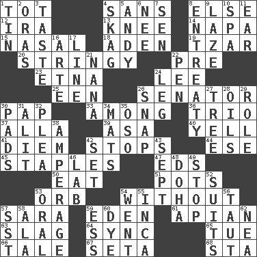 ACROSS 1. Small child 4. Without 8. Otherwise 12. Lyricist Gershwin 13. Leg joint 14. California wine valley 15. Rhinal 18. Arabian gulf 19. Czar 20. Slender, wiry 22. Before (prefix) 23. Inactive volcano in Sicily 24. Area sheltered from the wind 25. Car or cant ending 26. Elected representative 30. Infant food 33. Amid 36. Musical group of three 37. Silent film actress Nazimova 39. White ___ sheet 40. Shout 41. South Vietnam president (1954) 42. Closes up, plugs up 44. Compass dir. 45. Paper fasteners 47. Begley and Asner 50. Ingest 51. Cooking vessels 53. Globe 54. Sans 57. "Two Mules for Sister ____" 59. Paradise 61. Bee-related 63. Volcanic refuse 64. Synchronize (abbr.) 65. Third day of the wk. 66. Falsehood 67. Stalk of a moss capsule 68. R.R. building DOWN 1. Metal container 2. Mouths or openings 3. Clothes sense 4. Heroin 5. "60 Minutes" Commentator Rooney 6. Born 7. Elected rep. 8. Plea 9. Goldbrick 10. Health resort 11. Hearing organ 16. Johnson of "Laugh-In" 17. Actor's bit 21. Nanny 22. Animal enclosure 24. Part of a journey 26. Fastener 27. Relationship diagram 28. Lubricates 29. Hero or heavy, e.g. 30. Groovy apts. 31. Set down 32. Entreaty 34. Floor coverings 35. Bear (Spanish) 38. Electrical Measurement 42. Arrange properly for use 43. Back-to-school mo. 46. Experiment locale 48. Capital of the state of Qatar 49. Constrict 52. Costumes for special activities 53. Spoken 54. Gone 55. South American Indian 56. Drawn tight 57. Fast jet (abbr.) 58. In the manner of 59. Curvy letter 60. Color 62. Teachers' org.