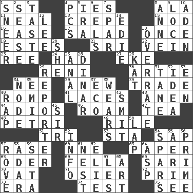 ACROSS 1. Fast jet (abbr.) 4. Sliced desserts 8. In the manner of 11. Actress Patricia 13. Streamer paper 15. Allow head to fall sleepily 16. Comfort 17. First course 18. At one time in the past 19. _____ Park, CO 21. _ Lanka 22. Distinctive style or manner 23. Portuguese money of account (variant) 24. Possessed 27. Supplement with great effort 29. Painter Guido (1575-1642) 30. Nick name for Arthur 34. Born 36. Afresh 39. Swap 40. Frolic 41. Shoestrings 43. So be it 44. Goodbye (Sp.) 46. Wander aimlessly 47. Beverage made from leaves 48. _ dish (used to culture cells) 49. Cause heat under the collar 51. Three (prefix) 53. R.R. building 54. Plant excrement 57. To erase 60. Compass dir. 63. Some stationery 65. Baltic tributary 66. Man or boy (slang) 69. Indian skirt 70. Large container 71. Flexible twig of a willow tree 72. Demure 73. Period 74. Trial 75. Perceive with the eye DOWN 1. Scornful expression 2. Gospel singer Marvin 3. Clothes sense 4. Personal Computers (abbr.) 5. Retirement account (abbr.) 6. Snakelike fish 7. Coast Guard woman 8. Queen of England 1702-14 9. Venues 10. An important port of Yemen 12. Area sheltered from the wind 14. Singer Brickell 18. Make much ado about nothing 20. A female animal or person 25. Of or related to the anus 26. Middle Eastern gold or silver currency 28. Krazy ___ of comics 29. Newsperson 31. Docile 32. The main thing one is thinking about 33. Car or cant ending 34. Connecting point 35. Give off 37. Environmental prefix 38. Erodes 40. Hit sharply and swiftly 42. Stricken, poetically 45. Title for a knight 50. Infant locale 52. A message received and understood 54. Practice fights 55. Nest on high 56. First class 57. Be footloose 58. The sixth month of the Jewish calendar 59. Stalk of a moss capsule 61. Egg locale 62. Writer Wiesel 64. Viper 67. French article 68. Nonscientific branch of learning