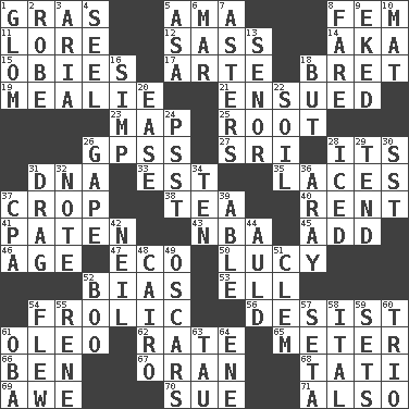 ACROSS 1. Pate de foie ____ 5. Nursemaid (var.) 8. Opposite of masc. 11. Old wives' tales, e.g. 12. Backtalk 14. Alias (abbr.) 15. Off-Broadway awards 17. Johnson of "Laugh-In" 18. Cy Young winner Saberhagen 19. Ear of corn 21. Took place subsequently 23. Atlas unit 25. Carrot, for example 26. Global Positioning Systems (abbr.) 27. _ Lanka 28. ___ a Wonderful Life 31. Heredity factor (abbr.) 33. Eastern Standard Time (abbr.) 35. Shoestrings 37. Riding implement 38. Beverage made from leaves 40. Monthly bill 41. Eucharist need 43. Basketball assoc. 45. Find the sum of 46. Ripen 47. Environmental prefix 50. "I Love _" 52. Prejudice 53. Pipe bend 54. Play 56. Cease 61. Margarine 62. Pace 65. Distance measurement 66. Benjamin's nick name 67. Northwest Algerian city 68. Jacques of French films 69. Deep reverence 70. Institute legal proceedings 71. In addition DOWN 1. Take by theft 2. Loose flowing garment 3. Roberta Peters solo 4. Stitch closed the eyes of (a falcon) 5. White ___ sheet 6. Spoil 7. Michaelmas daisies 8. Conductor's collection 9. Supplemented with great effort 10. Floor covering 13. Sir (Sp.) 16. Simple or foolish person 18. With the exception that 20. Comfort 22. Land 24. Inconspicuous attention getter 26. Open wide 28. On the rocks 29. Watch over 30. Fast jet (abbr.) 31. To draw with force 32. Observe 34. Nine, plus one 36. Like ___ of sunshine 37. Accounting whiz (abbr.) 39. Competent 42. Famous astronaut Armstrong 44. Old (Scot.) 48. Capital of Egypt 49. Motion picture awards 51. To starve (Brit.) 52. Oct. 31 cry 54. Soared 55. French philosopher Descartes 57. Stalk of a moss capsule 58. Slanted text style (abbr.) 59. Puts into a specified state 60. Musical group of three 61. Chief or king in Benin or Nigeria 63. The 19th letter of the Greek alphabet 64. Compass dir.