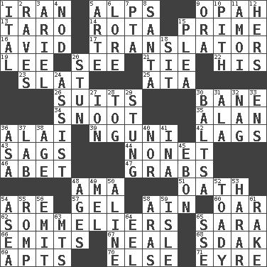 ACROSS 1. SW Asia republic 5. High mountains 9. Brightly colored fish 13. Edible starchy tuberous root 14. Round or rotation of duties 15. First class 16. Enthusiastic 17. Interpreter 19. Area sheltered from the wind 20. Perceive with the eye 21. Standoff 22. Part of HMS, perhaps 23. Narrow board 25. "One Day ___ Time" 26. Costumes for special activities 30. Object of repulsion 34. Snout, nose 35. ____ Jay Lerner 36. Jai _ 39. Group of southern Bantu languages 42. Fails to keep up a pace 43. Settles 44. Music written for nine 46. Collude with 47. Seizes 48. Nursemaid (var.) 51. Pledge 54. "We ___ not amused" (Victoria) 57. Set 58. The 18th letter of the Arabic alphabet 60. Rowing implement 62. Wine waiters 65. "Two Mules for Sister ____" 66. Sends forth 67. Anneal 68. Neighbor of Neb. 69. Flats, for short 70. Otherwise 71. Jane of fiction DOWN 1. Slanted text style (abbr.) 2. All-night dance parties 3. Satellite of Uranus 4. Allow head to fall sleepily 5. Johnson of "Laugh-In" 6. Old wives' tales, e.g. 7. Parent Teacher Assoc. 8. Before Barbara or Clara 9. Mouth or opening 10. Heart or essence 11. Mine, in Marseilles 12. Possessive pronoun 15. Entreaty 18. Be seated 20. Astound 24. Aid 27. Electrically charged atom 28. Coat; cloak 29. Feeling sharp psychological pain 30. Greek mezzo-soprano Agnes 31. Wing 32. Tired old horse 33. Followers of ems 36. White ___ sheet 37. Experiment locale 38. Grow older 40. Not either 41. _ tizzy (2 wds.) 45. Inky black, to poets 48. Eras 49. Cartoonist voice _ Blanc 50. Place in a line 52. Sycophant 53. Ethiopian city, capital of Harari 54. At sea 55. Frolic 56. Send forth 58. Caspian sea tributary 59. Capri or Wight 61. Libertine 63. Mountains (abbr.) 64. Snakelike fish 65. Compass dir.