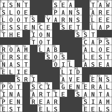 ACROSS 1. Is not 5. Ocean 8. The 23rd letter of the Hebrew alphabet 11. A type of plum 12. Baking dishes 14. "We ___ not amused" (Victoria) 15. Plunders 17. Tall tales 18. Area sheltered from the wind 19. Substance 21. Arrange properly for use 22. Infant locale 23. Definite Article 24. Electrically charged atom 25. Fast jet (abbr.) 27. Small child 28. Smile enhancers 31. Wander 35. Experiment locale 37. Medicinal plant 38. Celtic language 39. Mayday 41. For fear that 42. Political cartoonist Thomas 43. Petroleum 45. At sea 46. Writer Wiesel 47. Flaplike covering 49. Indian title of respect (Mr.) 51. "___ Maria" 52. Followers of ems 55. Plant holder 57. _-fi 60. Commissioned military rank 62. _ tizzy (2 wds.) 63. Nick name for Arthur 65. Before Barbara or Clara 66. Fenced enclosure 67. Stern 68. Thailand, formerly 69. Eastern Standard Time (abbr.) 70. Raised railways 71. Snakelike fish DOWN 1. Small island 2. Agitate, as a liquid 3. Trap for birds or small mammals 4. False hair 5. Health resort 6. Hearing organs 7. Singer Murray 8. Baron Munchausen's specialties 9. Length times width 10. Shed a tear 13. Fast planes 16. In a ____ (agitated or irritated) 17. Gossips 20. Calm and collected 26. Any of the three canals of the cochlea 29. Introduce or present, as a question 30. Bristle 31. French philosopher Descartes 32. Spoken 33. Aide 34. Distance measurement 36. Sometimes accompanies a hiss 40. Fodder prepared in a silo 44. Moving, as bait 48. Habitations of wild animals 50. Austrian river, tributary to the Danube 52. Bert's buddy 53. Relating to or accompanying birth 54. Shuts with force 55. Corncob 56. Washington bills 58. Algonquian 59. Slanted text style (abbr.) 61. Comfort 64. Big collection agency