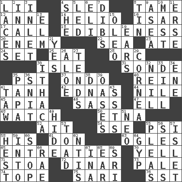 ACROSS 1. Cards in a Roman deck? 4. Downhill vehicle 8. Not wild 12. Queen of England 1702-14 14. Sun: prefix 16. Austrian river, tributary to the Danube 17. Give a ring to 18. The property of being fit to eat 20. Foe 22. Ocean 23. Had dinner 24. Put into a specified state 25. Consume 28. The grampus (Milton) 30. Small island 31. Message 35. Pacific Standard Time (abbr.) 37. Southwest Nigerian state 40. It's straight from the horse's mouth 41. Hyperbolic tangent 42. Ferber et al. 44. Mediterranean tributary 45. Capital of Western Samoa 46. Backtalk 47. Pipe bend 48. Observe 50. Inactive volcano in Sicily 52. Small island 54. Compass dir. 55. Air pressure measure (abbr.) 58. Part of HMS, perhaps 61. Spanish title 63. Stares 65. Pleas 70. Shout 71. Portico 72. Middle Eastern gold or silver currency 73. Diluted with white 74. Drink excessively 75. Indian skirt 76. Fast jet (abbr.) DOWN 1. Shoestrings 2. Empty; void 3. An arm off of a larger body of water 4. A female animal or person 5. Directed 6. Connecticut Ivy Leaguer 7. Rights 8. Shallow baking pan 9. Toward the sea 10. Vertical spar for supporting sails 11. Celtic language 13. Shade tree 15. Margarine 19. Hearing organs 21. Consenting reply 26. Medicinal plant 27. Looks after 29. Pupil covering 30. New York city 32. Famous astronaut Armstrong 33. Deli pickle 34. Compass dir. 35. Dad 36. In a ____ (agitated or irritated) 38. Heredity factor (abbr.) 39. Fertile tracts in a desert 41. The 23rd letter of the Hebrew alphabet 43. Fast planes 49. Flintstone garb 51. Modern: prefix 53. Frog relative 55. Entreaties 56. Exchanges for money 57. Small island 58. Command 59. To the inside or interior of 60. Obstruct or block passage 62. Nuclear Threat Initiatives 64. Hustle 66. Actress Charlotte 67. _ tizzy (2 wds.) 68. Hearing organ 69. Indian title of respect (Mr.)
