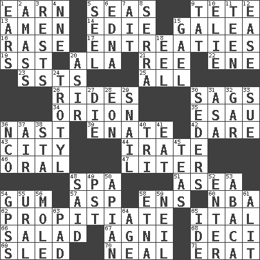 ACROSS 1. Merit 5. Oceans 9. Wig 13. So be it 14. Singer Brickell 15. An organ shaped like a helmet 16. Raze (variant) 17. Pleas 19. Fast jet (abbr.) 20. Wing 21. To sift 22. Compass dir. 23. Fast planes 25. Everything 26. Amusement-park features 30. Droops 34. Greek mythologigal hunter 35. He sold his birthright 36. Political cartoonist Thomas 39. Related on the mother's side 42. Have the gumption 43. Municipality 44. Feeling or showing extreme anger 46. Taken by mouth 47. 61 cubic inches 48. Health resort 51. At sea 54. Chewing product 57. Viper 58. Followers of ems 60. Basketball assoc. 62. Appease 65. Slanted text style (abbr.) 66. First course 67. Hindu god of fire 68. Tenth: prefix 69. Downhill vehicle 70. Actress Patricia 71. Part of Q.E.F. DOWN 1. Hearing organs 2. Collect or gather 3. Musical pauses 4. Compass dir. 5. Sew up the eyelids of hawks and falcons 6. Pulitzer Prize-winning author Ferber 7. Small island 8. Father Junipero _ 9. Make lace 10. Writer Wiesel 11. Adolescent 12. Relaxation 15. Highlander 18. Snakelike fish 20. SW Saudi Arabia district 24. Trinitrotoluene 27. Pass on 28. Period of immesurable duration 29. Slow-paced one 30. Spring feasts 31. White ___ sheet 32. Slender fish 33. Take to court 36. Non-commissioned officer (abbr.) 37. Wind 38. R.R. building 40. Three (prefix) 41. Consume 45. Beverages made from leaves 48. Expressed in words 49. Pacific Standard Time (abbr.) 50. Bee-related 52. Keyboard key 53. Phillipine bananalike plant 54. Global Positioning Systems (abbr.) 55. Mountain range 56. Undercover agent 58. Inactive volcano in Sicily 59. Famous astronaut Armstrong 61. Set down 63. Writing tablet 64. Grow older 65. Binary compound