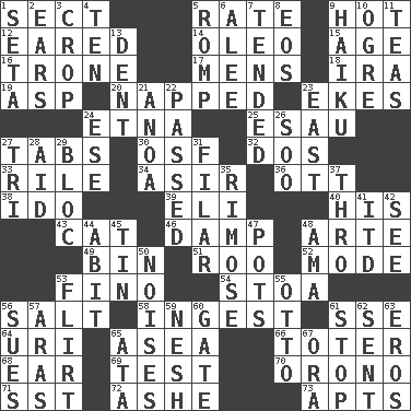 ACROSS 1. Religious group 5. Pace 9. Being at a high temperature 12. Having ears or earlike features 14. Butter sub 15. Mature 16. Heavy duty weighing machine 17. Not women's 18. Retirement account (abbr.) 19. Cleo's killer 20. Slept 23. Supplements with great effort 24. Inactive volcano in Sicily 25. Son of Isaac 27. Bar bills 30. Order of Saint Francis (abbr.) 32. Two (Sp.) 33. Cause heat under the collar 34. SW Saudi Arabia district 36. Baseball player Mel 38. Wedding promise 39. Biblical high priest 40. Part of HMS, perhaps 43. Domesticated feline 46. Moist 48. Johnson of "Laugh-In" 49. Storage container 51. Friend of Pooh 52. Method 53. A pale, very dry sherry 54. Portico 56. Table seasoning 58. Eat 61. Compass dir. 64. RI univ. 65. At sea 66. Carrier 68. Hearing organ 69. Trial 70. U. of Maine site 71. Fast jet (abbr.) 72. American tennis player Robert 73. Tenement units (abbr.) DOWN 1. Bristle 2. Hearing organs 3. Riding implement 4. "___ Little Indians" 5. Play 6. Toward shelter 7. Looked after 8. Greek goddess of the dawn 9. Japanese poetic form 10. Legendary monster 11. Afternoon social gatherings 13. Gouge 21. Small Philippine buffalo 22. Went by 23. 90 degrees 24. Compass dir. 26. "Barney Miller" actor Jack 27. Three (prefix) 28. Help 29. Group of countries in special alliance 31. Of or pertaining to a thread or threads 35. Full of chinks, cracks, or crevices 37. Through, poetically 41. It would 42. Observe 44. "This won't hurt ____!" 45. Metal container 47. Plant holders 48. Nanny (var.) 50. Annoying sounds 53. Talk or behave amorously 55. Von Bismarck 56. Takes to court 57. Caspian sea tributary 59. Delicate 60. Yard entry 61. Halt 62. Posted 63. Greek god of love 65. _ moment's notice (2 wds.) 67. Mouth or opening