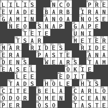 ACROSS 1. Ms. Damita and namesakes 6. Non-commissioned officer (abbr.) 9. Before (prefix) 12. Dodge 13. Sharp remark 14. SW Asia republic 15. Homeless child 16. Small Philippine buffalo 17. Sense of smell 18. Modern: prefix 19. Fastener 20. Open wide 21. Wig 23. Single; one (prefix) 24. Russian ruler of old 25. Distance measurement 28. Third mo. 30. Amusement-park features 34. Travel on an animal 35. Epoch 36. Thick mixture 38. Santa ___, CA 39. Cub Scout units 41. Erodes 43. Scottish cap 44. Artist's stand 46. Migrant worker of the '30s 48. Area sheltered from the wind 49. Prepare for publication 50. Small boys 51. Hollow 53. Part of HMS, perhaps 56. Quote 57. Actor Lugosi 58. Monte _, Las Vegas Hotel/Casino 60. Scent 61. Sign of something about to happen 62. Sea 63. For each 64. Bear (Spanish) 65. Clothes sense DOWN 1. Part of a journey 2. "Terrible" tsar 3. Unable to walk 4. Foolish or stupid persons 5. Elected rep. 6. Grandmother 7. Riding implement 8. Chief or king in Benin or Nigeria 9. Conciliate 10. Raze (variant) 11. Compass dir. 13. Object of repulsion 14. More empty; more void 19. Remove all contents or possession from 20. Chewing product 22. Ewer handle 24. Interpreter 26. Pulitzer Prize-winning author Ferber 27. 480, 500 or 516 sheets of paper 28. Ancient Persian 29. Type of rug 31. Simpleton 32. Compass dir. 33. R.R. building 37. Wear away 40. Sowing specialist 42. What Jean-Claude Killy likes to do 45. French article 47. New York city 49. Liveliness 50. Event that recurs at intervals 51. Folds over and sews together 52. Margarine 54. Angers 55. Narrow board 56. Police officer (slang) 57. Sometimes accompanies a hiss 58. Small bed 59. Single