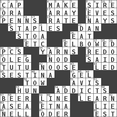 ACROSS 1. Head covering 4. Cause to be 8. Beget 12. Mouth or opening 13. Like ___ of sunshine 14. Nights before holidays 15. Actor Sean's family 18. Assign a rank or rating to 19. Negative votes 20. Paper fasteners 22. One of the 12 tribes of Israel 23. Portico 24. Ingest 25. And so on (abbr.) 26. Shoved, as through a crowd 30. Personal Computers (abbr.) 33. Tall tales 36. Do over again 37. Cassini of fashion 39. Allow head to fall sleepily 40. Alleged 41. Ballerina skirt 42. Trap for birds or small mammals 44. Directed 45. French poetic form 47. Set 50. Pull behind 51. Opinion 53. Attila the _ 54. Inveterate users 57. Fermented drink made from hops 59. Actor's bit 61. Memorize 63. At sea 64. Inactive volcano in Sicily 65. Falsehood 66. 1994 drama film starring Jodie Foster 67. River in Europe 68. Eastern Standard Time (abbr.) DOWN 1. Police officer (slang) 2. Ancient Greek god of war 3. Leg coverings 4. Female horse 5. Ancient river in northeast Turkey 6. Krazy ___ of comics 7. Sight organ 8. Legislators 9. _ the terrible 10. Marina Del _, California 11. Curvy letter 16. Nathan's nickname 17. Blemish 21. Made of lace 22. Pat or tap gently 24. Raised railways 26. Conclusions 27. Welt 28. Singer Brickell 29. Texas town _ City 30. Plant holders 31. A slight indication 32. Puts into a specified state 34. Small Philippine buffalo 35. Friend of Pooh 38. From the throat 42. Compass dir. 43. Mild oath 46. Electrically charged atom 48. Tending to cause great harm 49. Louse (plural) 52. Showing deterioration from age 53. The bottom of a shoe or boot 54. Singer Murray 55. Letter starter 56. Indian titles of respect 57. Bar 58. Compass dir. 59. Lion 60. It would 62. Fish or hair follower