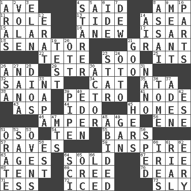 ACROSS 1. "___ Maria" 4. Alleged 8. Electrical Unit 11. Hero or heavy, e.g. 13. Periodic rise and fall of the sea level 14. At sea 15. Having or resembling wings 16. Afresh 17. Austrian river, tributary to the Danube 18. Legislator 21. Let have 22. Wig 23. "Barney Miller" actor Jack 25. It is 26. Also 29. Ski resort town in Vermont 32. Virtuous person 34. Domesticated feline 35. "One Day ___ Time" 38. Small Philippine buffalo 39. Stone: prefix 41. Thickened enlargement 43. Cleo's killer 44. Wedding promise 45. Residences 46. Electrical Measurement 50. Compass dir. 51. Bear (Spanish) 54. "___ Little Indians" 55. Soap units 57. All-night dance parties 59. Stimulate to action 63. Grows older 64. Disposed of to a purchaser 67. One of the Great Lakes 68. Portable shelter 69. Algonquian 70. Letter starter 71. Double-curved letter 72. On the rocks 73. Roguish DOWN 1. Caspian sea tributary 2. Short-tailed, large-bodied rat 3. Flair 4. A viewer who gazes fixedly 5. The 18th letter of the Arabic alphabet 6. Binary compound 7. Morning condensation 8. Slender Brazilian palm 9. Intended 10. Components 12. Part of Q.E.F. 14. Atmosphere 19. Trial 20. Baseball player Mel 21. Thick or sticky substance 23. Play the lead 24. Von Bismarck 26. White ___ sheet 27. Nanny 28. "Vaya con ____" 30. Thespian 31. Billionth: prefix 33. California wine valley 36. Heavy book 37. Arabian gulf 39. Corncob 40. Locale of original sin 42. Compass dir. 45. Possessive pronoun 47. Mountains (abbr.) 48. Stayed 49. Separate the seeds from cotton 51. Speak pompously 52. Gurus 53. Baking chambers 56. Moved rapidly 58. Eastern Standard Time (abbr.) 60. Angers 61. Monetary unit of Yemen 62. Suggestive of the supernatural 64. _-fi 65. The grampus (Milton) 66. Area sheltered from the wind