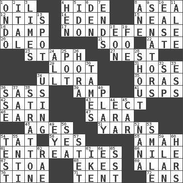 ACROSS 1. Petroleum 4. Flintstone garb 8. Toward the sea 12. Nuclear Threat Initiatives 14. Locale of original sin 15. Be tempered by heat 16. Moist 17. Unrelated to defense, as in spending 20. Butter sub 21. "Barney Miller" actor Jack 22. Had dinner 23. Staphylococcus 27. Egg locale 29. Spoils 31. Stockings 34. Extreme 35. Mouths or openings 36. Backtalk 39. Electrical Unit 41. United States Postal Service (abbr.) 42. Suttee (variant) 43. Opt 46. Merit 47. "Two Mules for Sister ____" 48. Matures 51. Entertaining tales 54. Make lace 56. It is so 58. Housemaid 61. Pleas 66. Mediterranean tributary 67. Portico 68. Supplements with great effort 69. Having or resembling wings 70. Prong on a fork 71. Portable shelter 72. Followers of ems DOWN 1. Southwest Nigerian state 2. Slanted text style (abbr.) 3. Citrus fruits 4. Layer 5. Wedding promise 6. Lair 7. Extremities 8. One (Scot) 9. Legislators 10. Compass direction 11. Toward shelter 13. Specific locale 18. Age 19. Enemy 24. 100% 25. Plant holder 26. Israeli folk dance 28. Yell 30. Makes less strong or intense 32. Plant excrement 33. Double-curved letter 34. Putting into practice 36. Compass dir. 37. American Automobile Association (abbr.) 38. Ski resort town in Vermont 40. Shaw product 44. Epoch 45. Automobile 49. Sight organ 50. Ocean 52. Grandmother 53. Grin 54. Trial 55. Opposed to 57. Proofreading order 59. ____ Jay Lerner 60. Possessive pronoun 62. Actress Charlotte 63. D.D.E's nickname 64. Car or cant ending 65. Fast jet (abbr.)