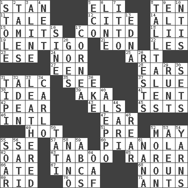 ACROSS 1. Comedian Laurel of Laurel & Hardy 5. Biblical high priest 8. "___ Little Indians" 11. Falsehood 12. Quote 14. The first octave above the treble staff 15. Leaves out 17. Continued (abbr.) 18. Cards in a Roman deck? 19. Small, flat, pigmented spot on the skin 21. Age 22. French article 23. Compass dir. 24. Not either 25. Nonscientific branch of learning 27. Car or cant ending 28. Hearing organs 31. Baby powder 35. Perceive with the eye 37. Change direction abruptly 38. It may be bright or harebrained 39. Alias (abbr.) 41. Portable shelter 42. Lightbulb-shaped fruit 43. Raised railways 45. Fast planes 46. International (abbr.) 47. Ewer handle 49. Being at a high temperature 51. Before (prefix) 52. Can I? 55. Compass dir. 57. Santa ___, CA 60. Player piano 62. Rowing implement 63. Off limits 65. More uncommon 66. Had dinner 67. South American Indian 68. Part of speech 69. To free from 70. Order of Saint Francis (abbr.) 71. Pismires DOWN 1. Took without asking 2. Makes less strong or intense 3. Place in a line 4. Remaining after all deductions 5. Environmental prefix 6. Actor's bit 7. "Tell ____ the Marines!" 8. Baron Munchausen's specialties 9. Writer Wiesel 10. Nuclear Threat Initiatives 13. Pulitzer Prize-winning author Ferber 16. Trig term 17. Pupil covering 20. Travels 26. Musical pauses 29. The smallest animal of a litter 30. Arranges properly for use 31. Native american tent (variation) 32. An important port of Yemen 33. Tough but pliablecoriaceous 34. Monte _, Las Vegas Hotel/Casino 36. Make supply last 40. City in Syria 44. Indian skirt 48. Rump 50. Jacques of French films 52. Person of subnormal intelligence 53. Native American of Southwest Alaska 54. Tall tales 55. Fly high 56. Suttee (variant) 58. Billionth: prefix 59. Lettered men learn these first 61. Grandmother 64. Clumsy lout