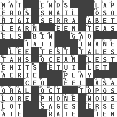 ACROSS 1. Floor protector 4. Conclusions 8. Infant locale 11. Greek god of love 13. Slow-paced one 15. Bear (Spanish) 16. Swiss mountan, "Queen of the Mountains" 17. Father Junipero _ 18. Collude with 19. Memorize 21. Car or cant ending 22. Beverages made from leaves 23. Raised railways 24. Storage container 27. E Mali city 29. Jacques of French films 30. Empty; void 34. Area sheltered from the wind 36. Trial 39. Stories 40. Scottish caps 41. Sea 43. For fear that 44. Gives off 46. Needle holder 47. Allow 48. Nest on high 49. Live dramatic performance 51. Corporate head (abbr.) 53. Snakelike fish 54. White ___ sheet 57. Relating to the mouth 60. Sep. follower 63. Literary convention 65. Old wives' tales, e.g. 66. Give a jingle 69. Good sense 70. Car dealer's back yard 71. Gurus 72. Celtic language 73. Had dinner 74. Pace 75. "___ Little Indians" DOWN 1. Haggard of country music 2. Satellite of Uranus 3. Ancient Roman robes 4. Double-curved letter 5. Compass dir. 6. Have the gumption 7. Father 8. Ear part 9. At sea 10. Plant holders 12. Title for a knight 14. Austrian-born American filmmaker Fritz 18. Lacking a tonal center or key 20. Basketball assoc. 25. "Tell ____ the Marines!" 26. Sibling's daughter 28. Small island 29. A testis 31. Toward shelter 32. Egg locale 33. Eastern Standard Time (abbr.) 34. Unable to walk 35. Arab leader 37. Arrange properly for use 38. Grayish beige 40. Beverage made from leaves 42. The longest river in the world 45. Perceive with the eye 50. Keyboard modifier key 52. I made a mistake 54. To the left, to Queeg 55. Lush 56. NE Netherlands city 57. Water jar 58. Carrot, for example 59. Johnson of "Laugh-In" 61. Burn to charcoal 62. Ancient Roman robe 64. Single 67. Fish or hair follower 68. Compass dir.