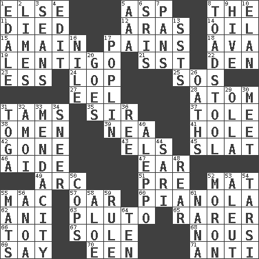ACROSS 1. Otherwise 5. Viper 8. Definite Article 11. Passed on 12. Ancient river in northeast Turkey 14. Lubricate 15. At full speed 17. Aches 18. Actress Gardner 19. Small, flat, pigmented spot on the skin 21. Fast jet (abbr.) 22. Lair 23. Double-curved letter 24. Trim (branches) 25. Mayday 27. Snakelike fish 28. Smallest unit of an element 31. Scottish caps 35. Title for a knight 37. Lacquered or enameled metalware 38. Sign of things to come 39. Teachers' org. 41. Opening into or through something 42. Went 43. Raised railways 45. Narrow board 46. Assistant 47. Ewer handle 49. Curve 51. Before (prefix) 52. Floor protector 55. Apple computer (short form) 57. Rowing implement 60. Player piano 62. Cuckoo 63. Mickey's pet 65. More valued for its uncommonness 66. Small child 67. Not divided or shared with others 68. Horse sense 69. Declare 70. Car or cant ending 71. Against DOWN 1. Peak District village in England 2. Citrus fruits 3. Actors Connery and Penn 4. Prepare for publication 5. Auto club (abbr.) 6. Indian titles of respect 7. Baking dishes 8. Inedible or poisonous agaric 9. Hub of activity 10. Flair 13. Fast planes 16. Mediterranean tributary 17. Cotton for raincoats, e.g. 20. Moves 26. Profane or obscene expressions 29. Water jar 30. Rendezvous 31. Ancient Roman robe 32. Mine, in Marseilles 33. Ananias' fault 34. Contemptuous expression 36. To riddle 40. City in Syria 44. Indian skirt 48. Buttocks 50. 911 reaches them 52. Person of subnormal intelligence 53. Eskimo relative 54. Tarsus (plural) 55. Floor coverings 56. Small Philippine buffalo 58. _ vera 59. Governing power 61. Grandmother 64. "___ Little Indians"