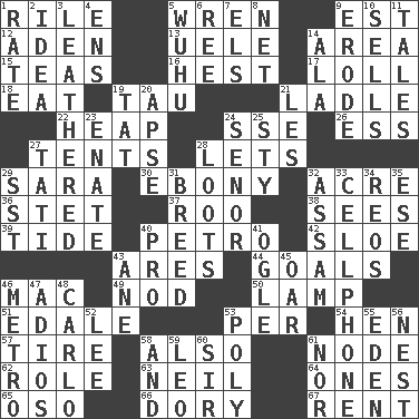 ACROSS 1. Cause heat under the collar 5. Songbird 9. Eastern Standard Time (abbr.) 12. An important port of Yemen 13. Ubangi River tributary 14. Length times width 15. Afternoon social gatherings 16. Behest 17. Hang loosely or laxly 18. Ingest 19. The 19th letter of the Greek alphabet 21. Dipping utensil 22. Pile 24. Compass dir. 26. Double-curved letter 27. Portable shelters 28. Allows 29. "Two Mules for Sister ____" 30. Black 32. 43,560 square feet 36. Proofreading order 37. Friend of Pooh 38. Perceives with the eye 39. Event that recurs at intervals 40. Stone: prefix 42. A type of plum 43. Ancient Greek god of war 44. Scores awarded for successful feats 46. Big _ 49. Allow head to fall sleepily 50. Desk light 51. Peak District village in England 53. For each 54. Layer 57. Become fatigued 58. In addition 61. Thickened enlargement 62. Hero or heavy, e.g. 63. Famous astronaut Armstrong 64. Singles 65. Bear (Spanish) 66. Small, narrow, flatbottom fishing boat 67. Monthly bill DOWN 1. Assign a rank or rating to 2. The content of cognition 3. Tough but pliablecoriaceous 4. Followers of ems 5. Chinese city south-southwest of Nanjing 6. To sift 7. Raised railways 8. Fish or hair follower 9. Eat (away) 10. Exchanges for money 11. Lies 14. Insect wing 19. Make lace 20. Domed church section 21. French article 23. Maternal 24. Sir (Sp.) 25. Filthy place 27. Jacques of French films 28. Plunders 29. Fast jet (abbr.) 31. A special lineage 32. Indian state 33. Portable communications device 34. Vintage cars 35. Compass dir. 40. Adept person 41. Stare 43. One (Scot) 45. Boat paddle 46. Paris' subway 47. Goodbye (Sp.) 48. Monte _, Las Vegas Hotel/Casino 52. Area sheltered from the wind 53. Much (prefix) 55. Paradise 56. A home for chicks 58. Plus 59. Lion 60. Title for a knight 61. And not